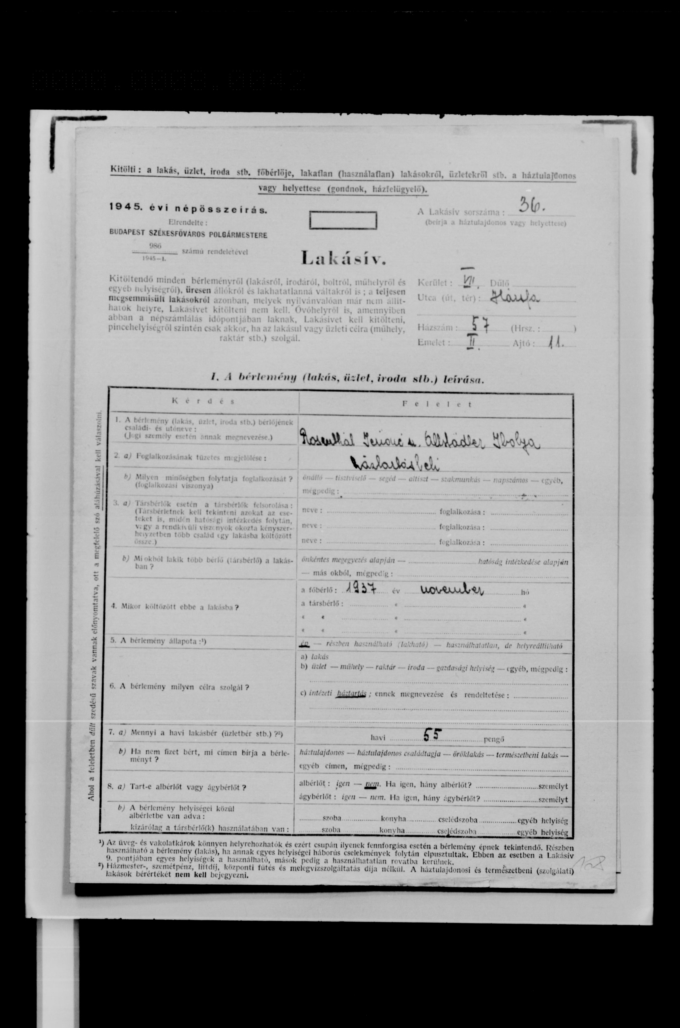 Questionnaire filled out by Rosenthál Jenőné, (nee Altstädter Ibolya), residing at Hársfa u., 57, 11, Quarter VII, in the context of the Population Census in Budapest, 1945