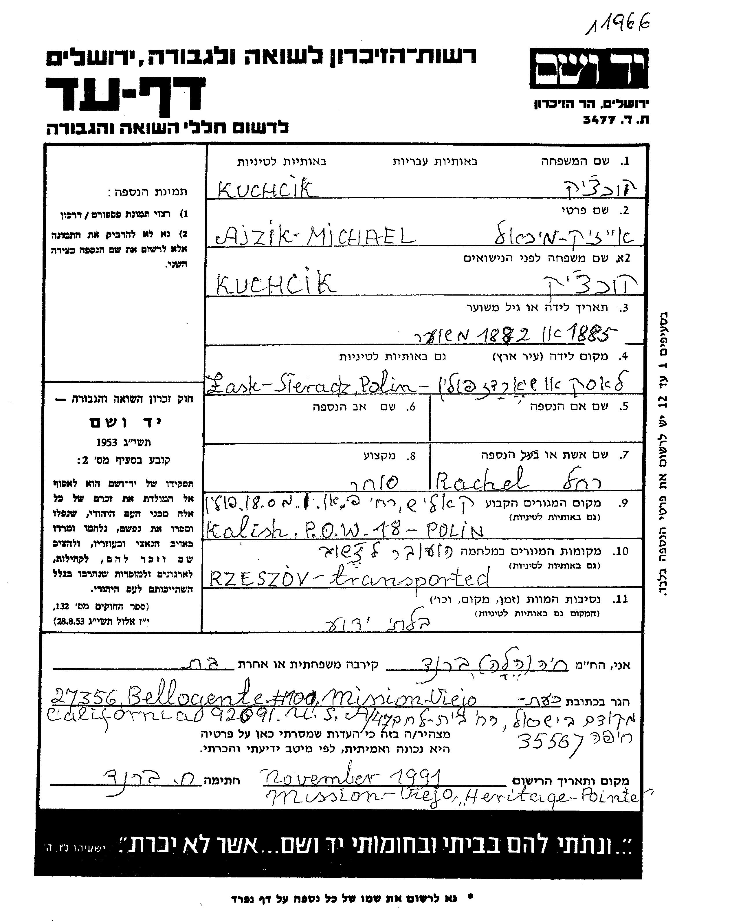 Aizik Mikhael Kukhchik was born in Lodz, Poland, 1885. He was a merchant. Prior to WWII he lived in Kalisz, Poland. Aizik Mikhael was murdered in the Shoah. Place of death: unstated place.