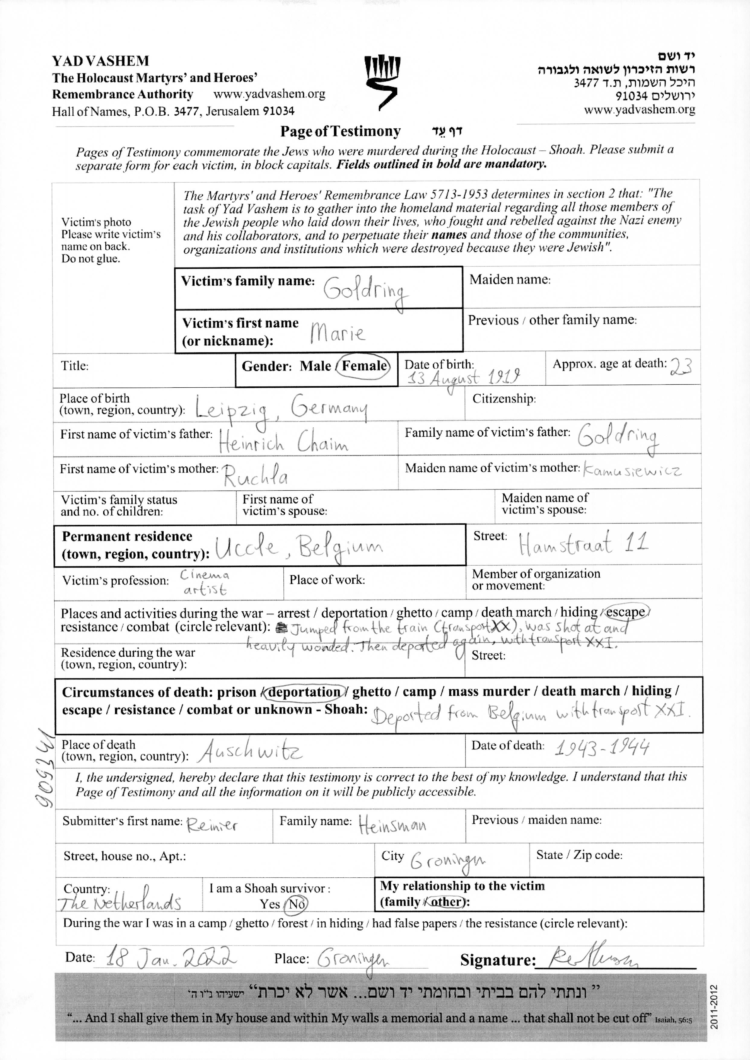 Marie was murdered in the Shoah. Place of death: Auschwitz, Poland, 1943.