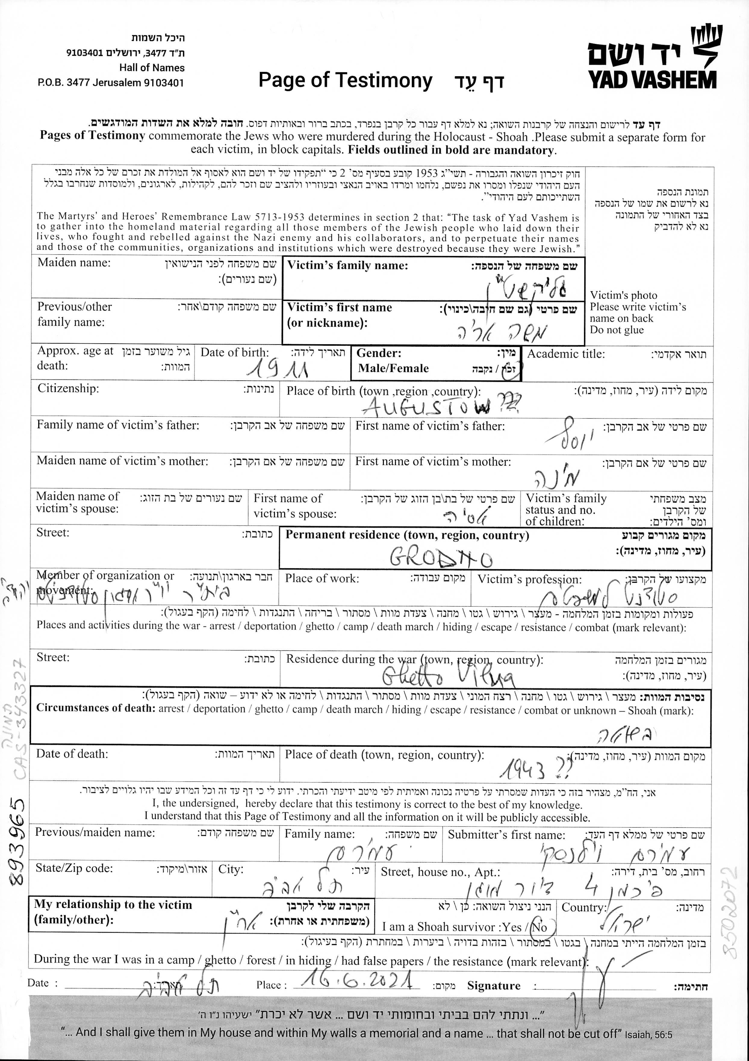 | Glikshtein | Moshe Arie | 1911 | Grodno, Poland | Page of Testimony |