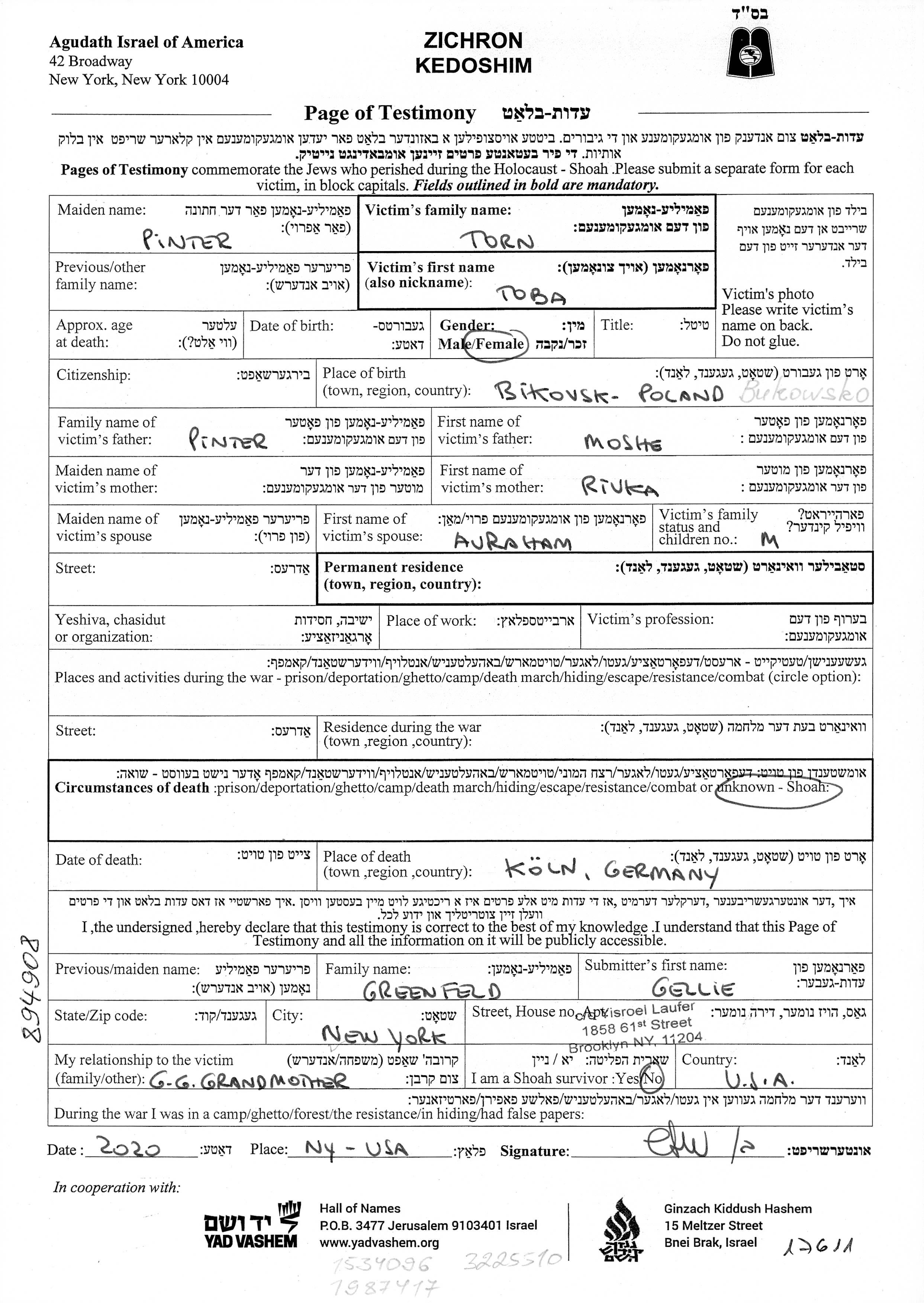 | Torn | Towa | Koeln, Germany | Page of Testimony | |