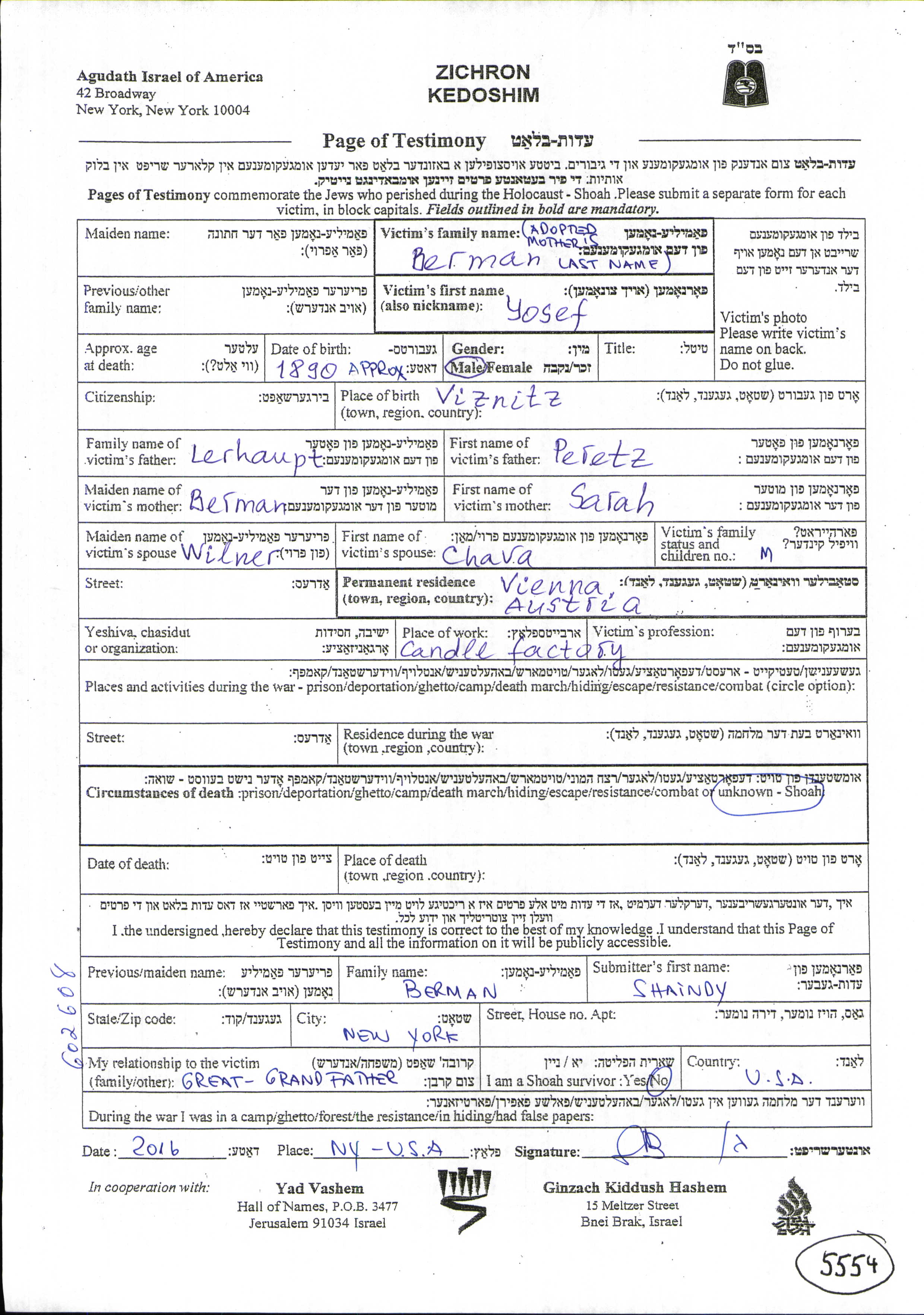Berman Yosef 1890 Wien, Austria Page of Testimony