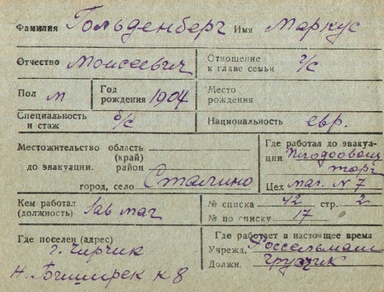 | Goldenberg | Markus | 1904 | Stalino, Ukraine (USSR) | List of evacuated persons |