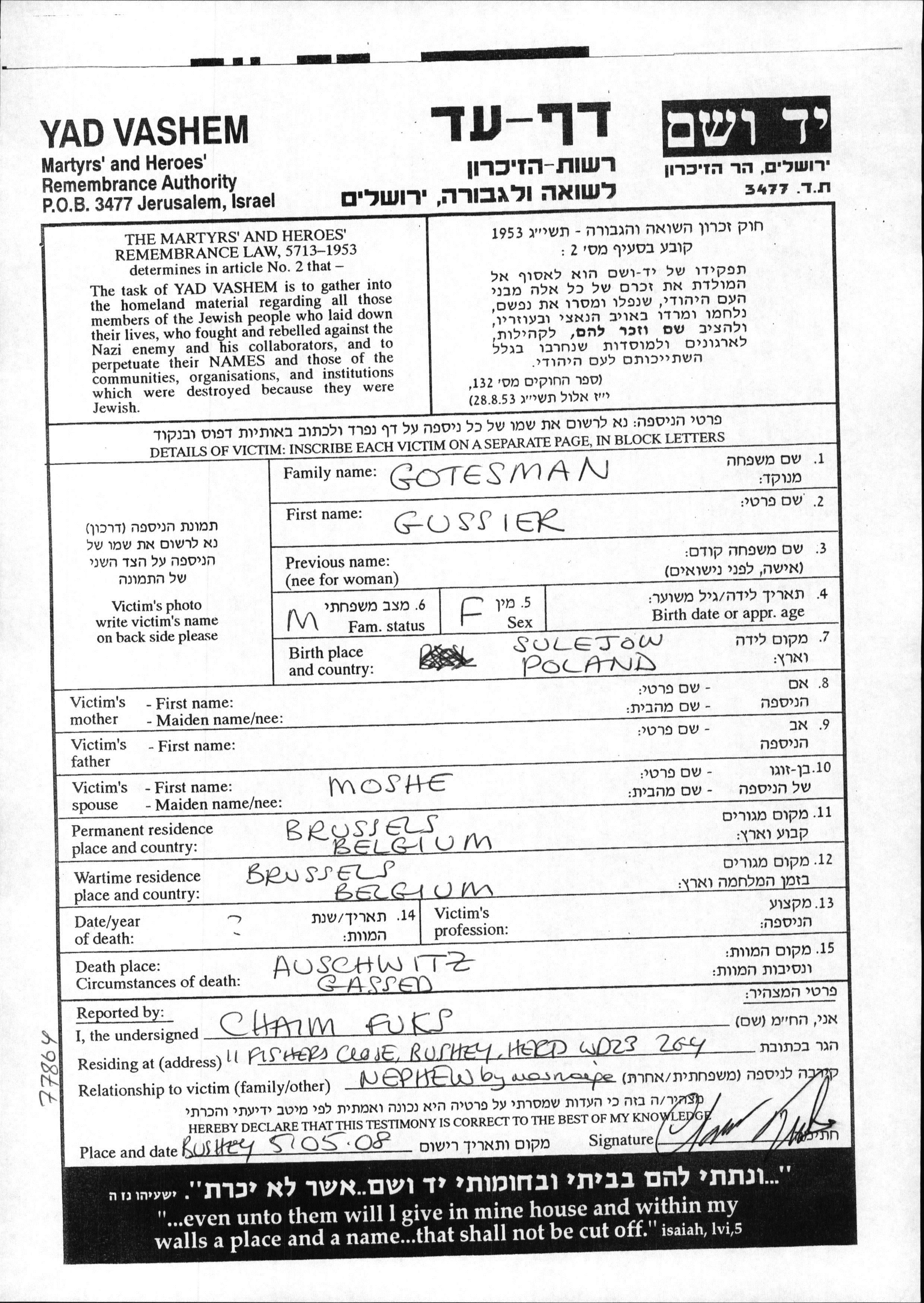 Gucia Gussier Gotesman was born in Sulejow, Poland, 1924. She was a handelschuler/in. Prior to WWII she lived in Brussels, Belgium. Gucia Gussier was murdered in the Shoah. Place of death: Auschwitz, Poland.