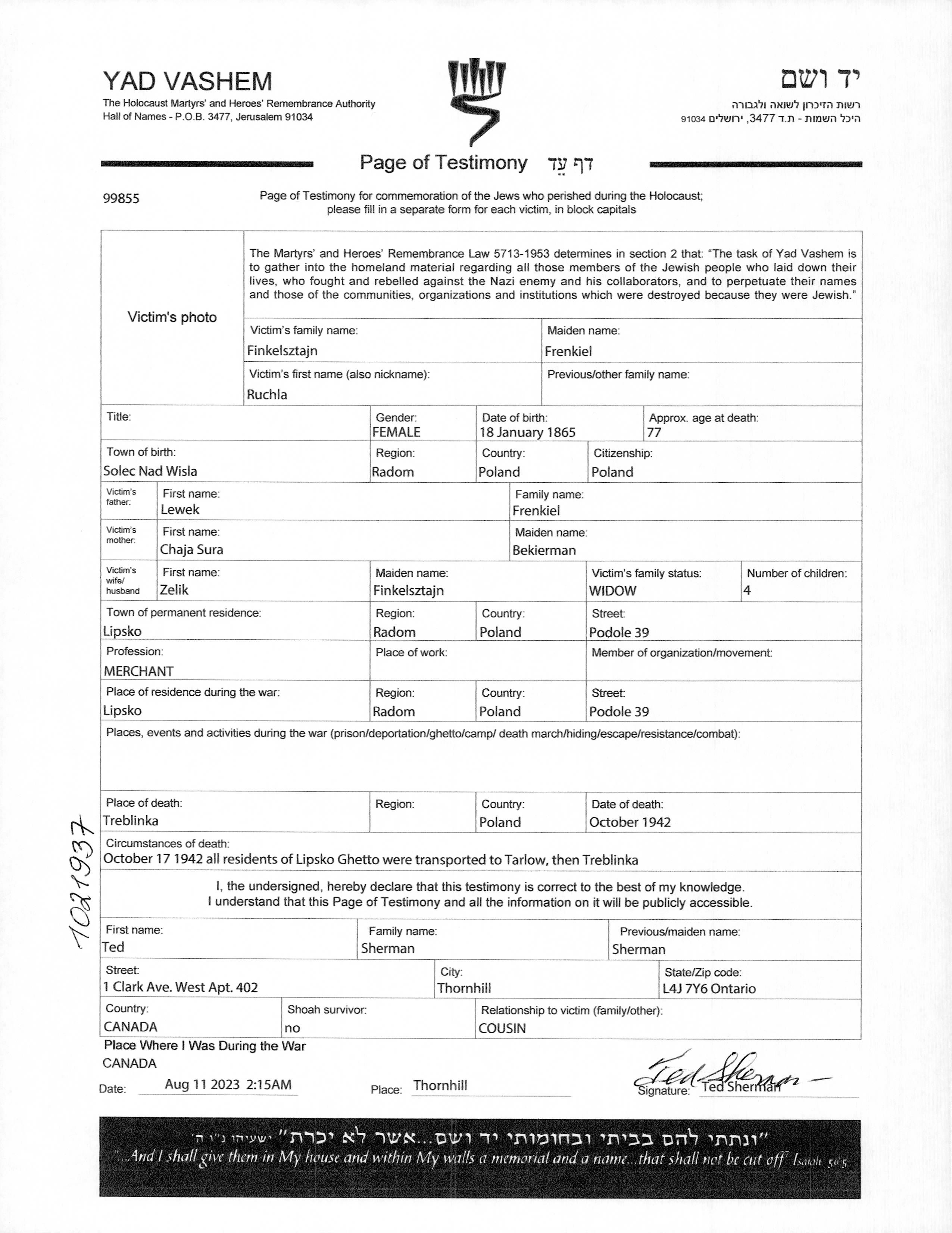 Ruchla Finkelsztajn nee Frenkiel was born in Solec nad Wisla, Poland, 1865 to Lewek and Chaja Sura nee Bekierman. She was a merchant and a widow of Zelik. Prior to WWII she lived in Lipsko, Poland. During the war she was in Lipsko, Poland. Ruchla was murdered in the Shoah. Place of death: Treblinka, Poland, 10/1942.