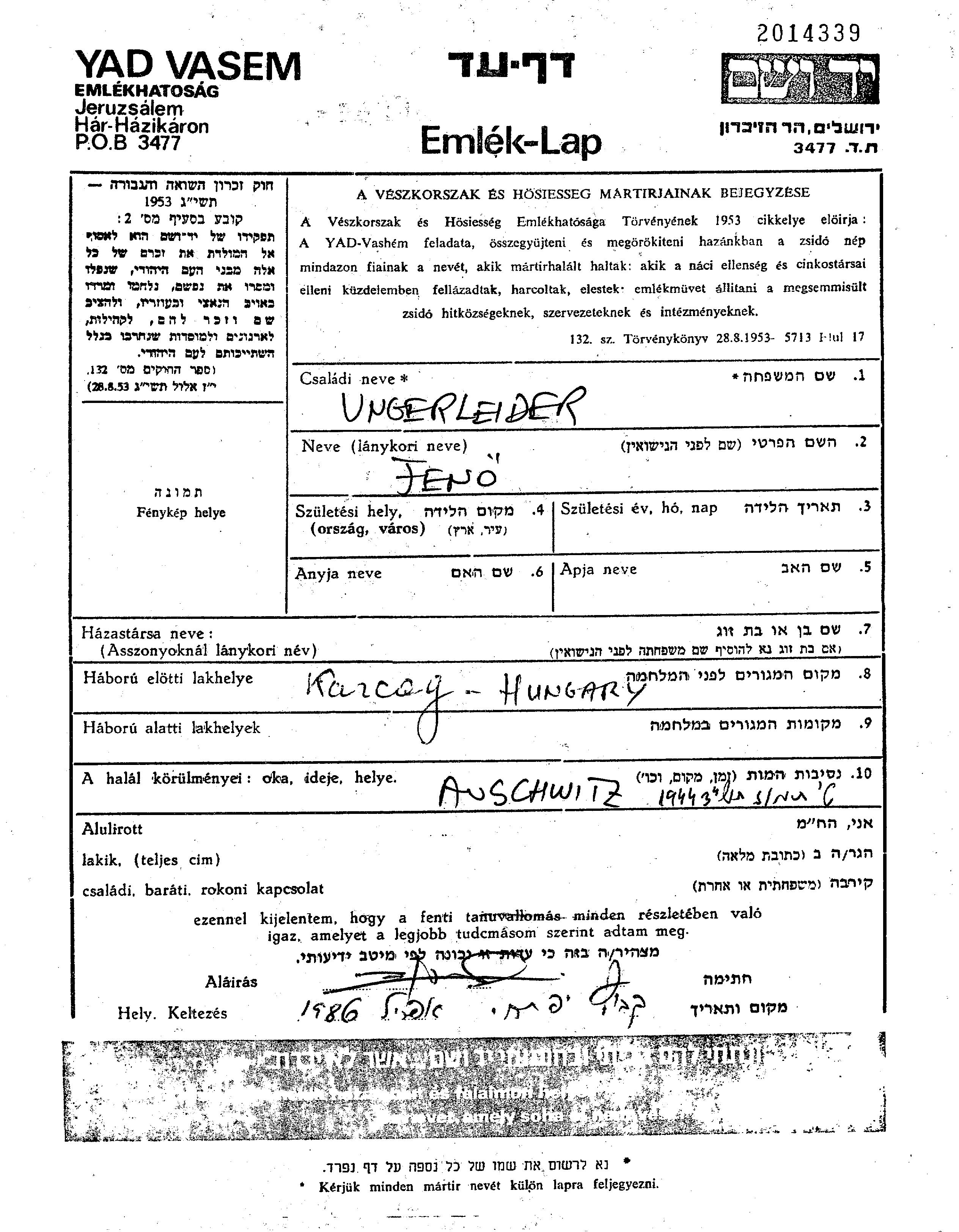 Ungerleider Jeno Karcag, Hungary Page of Testimony