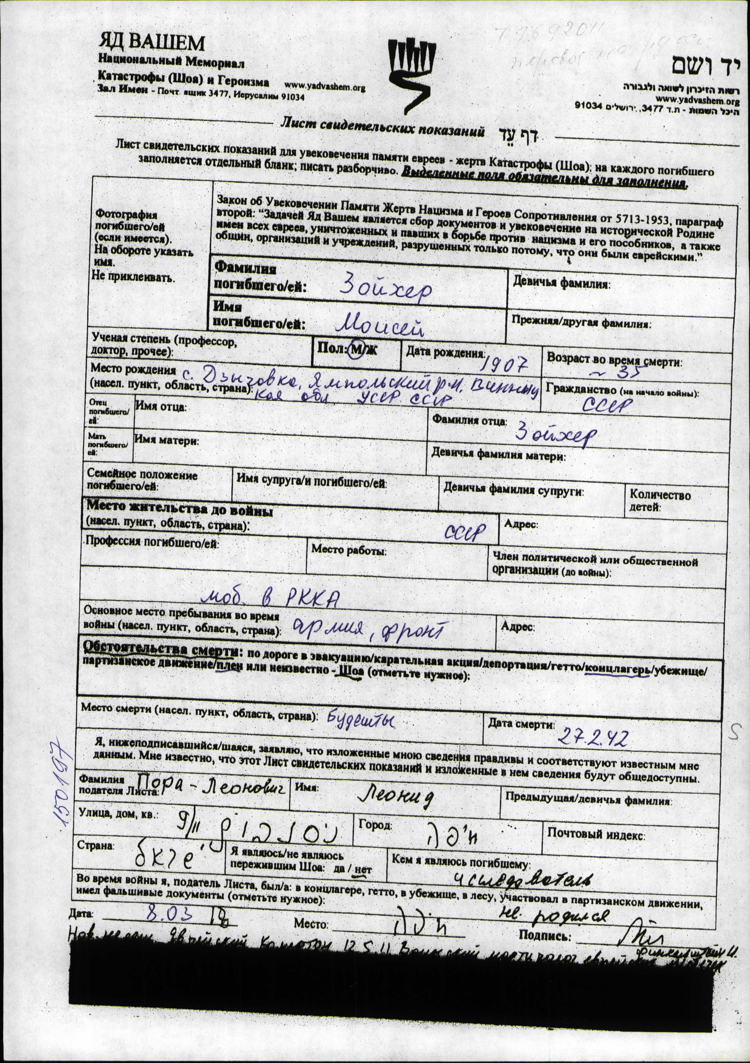 Moisei Zoykher Sojcher was born in Dzygovka, Ukraine (USSR), 1907. He was a bookkeeper. Prior to WWII he lived in Dzygovka, Ukraine (USSR). Moisei was murdered in the Shoah. Place of death: Dulag 202 Budeşti, Romania, 27/02/1942.