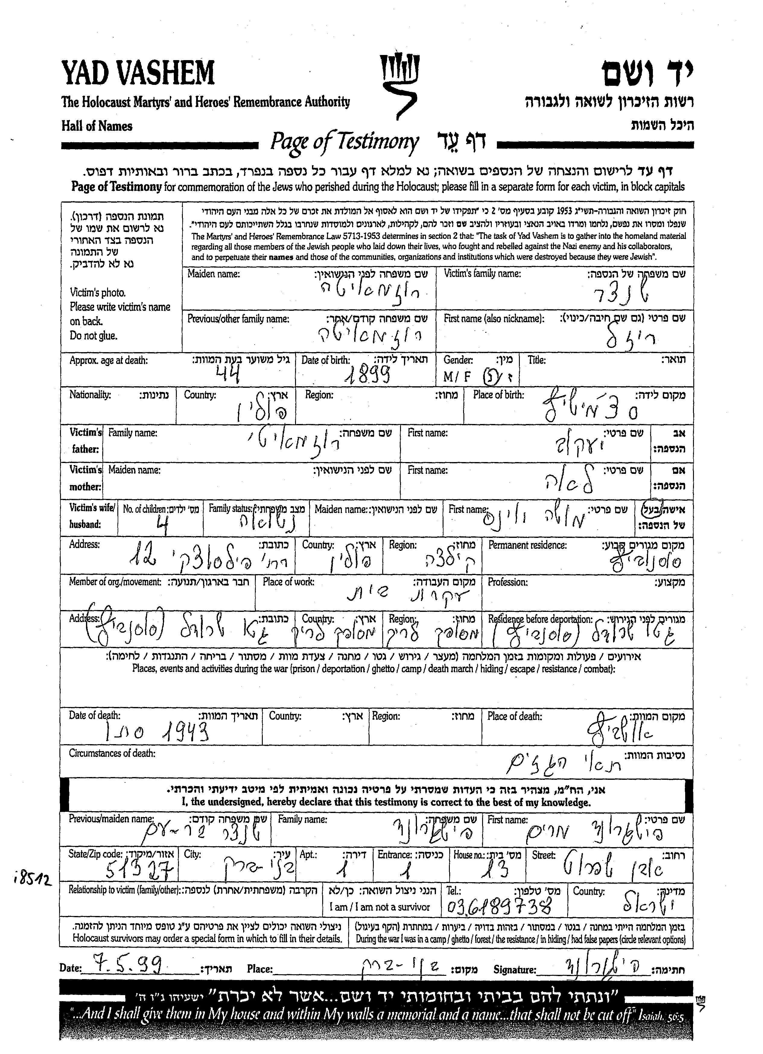 Yad Vashem - Pages of Testimony Names Memorial Collection