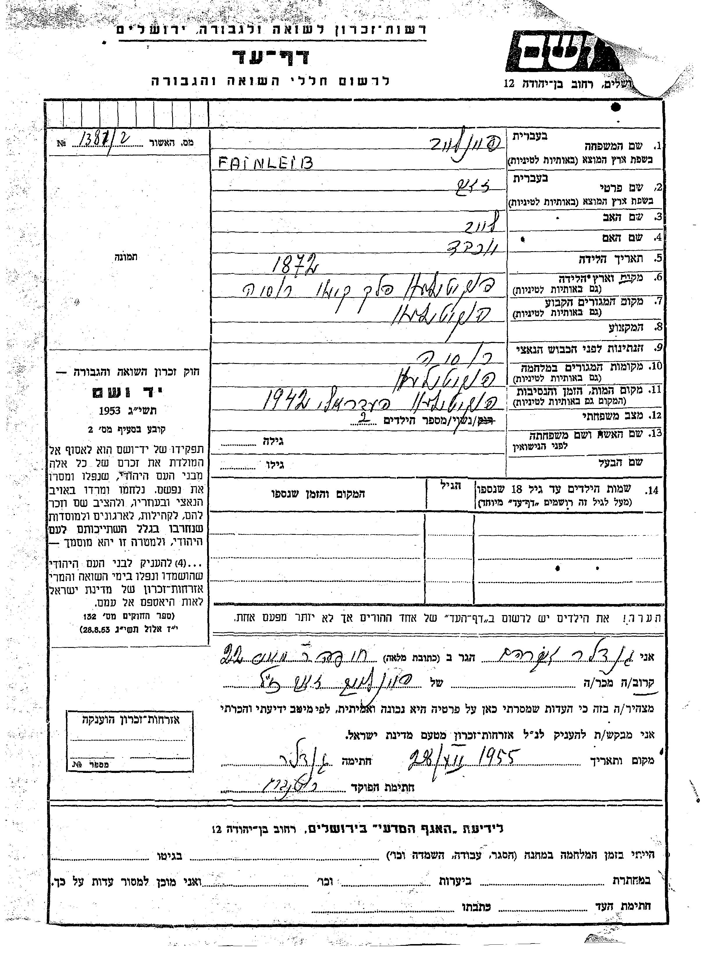 Zeev Fainleib was born in Pokotilovo, Ukraine (USSR), 1872 to Leib and Yokheved. He was married. Prior to WWII he lived in Pokotilovo, Ukraine (USSR). During the war he was in Pokotilovo, Ukraine (USSR). Zeev was murdered in the Shoah. Place of death: Pokotilovo, Ukraine (USSR), 1942.