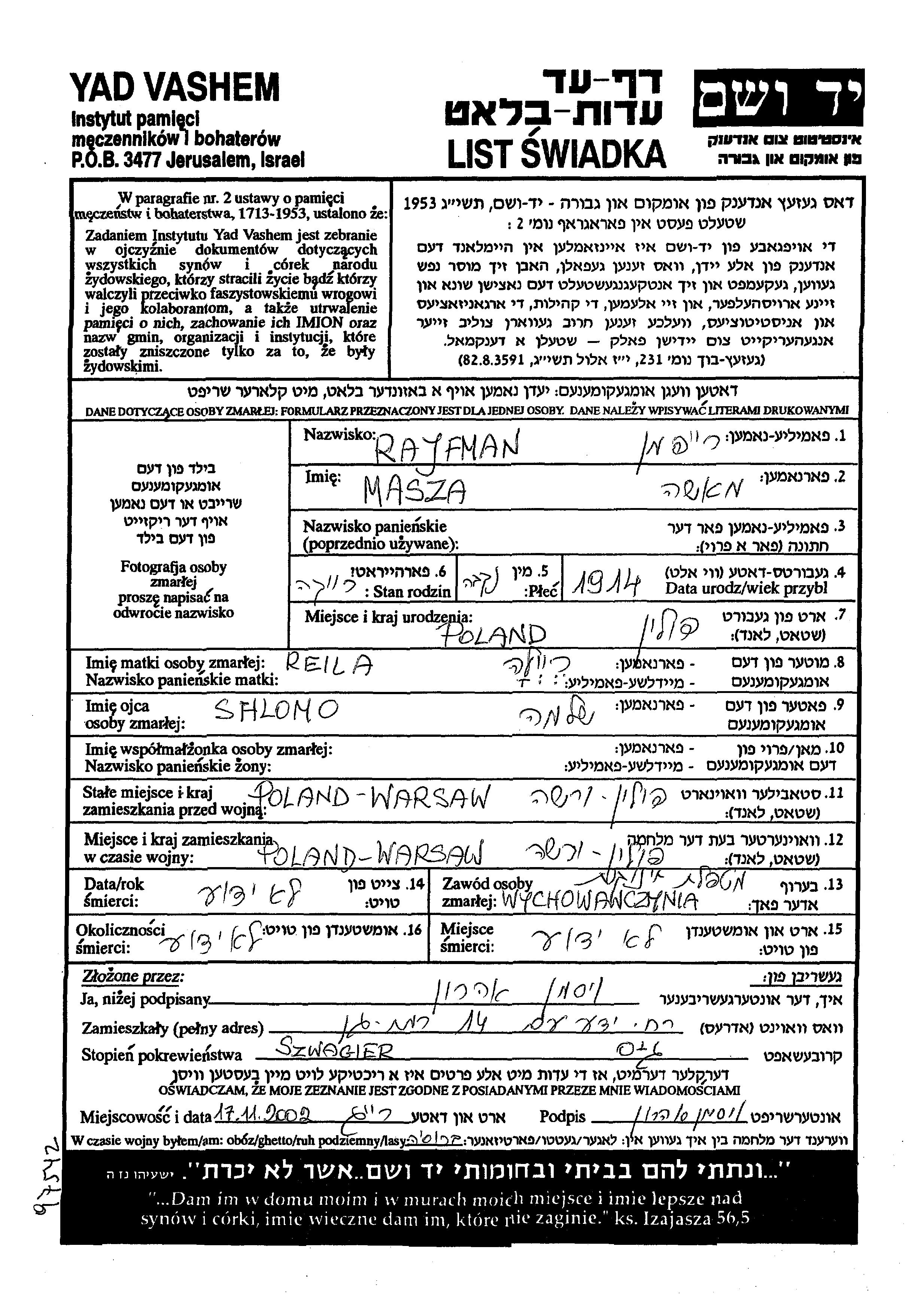 Rajfman Masza 1914 Warsaw, Poland Page of Testimony