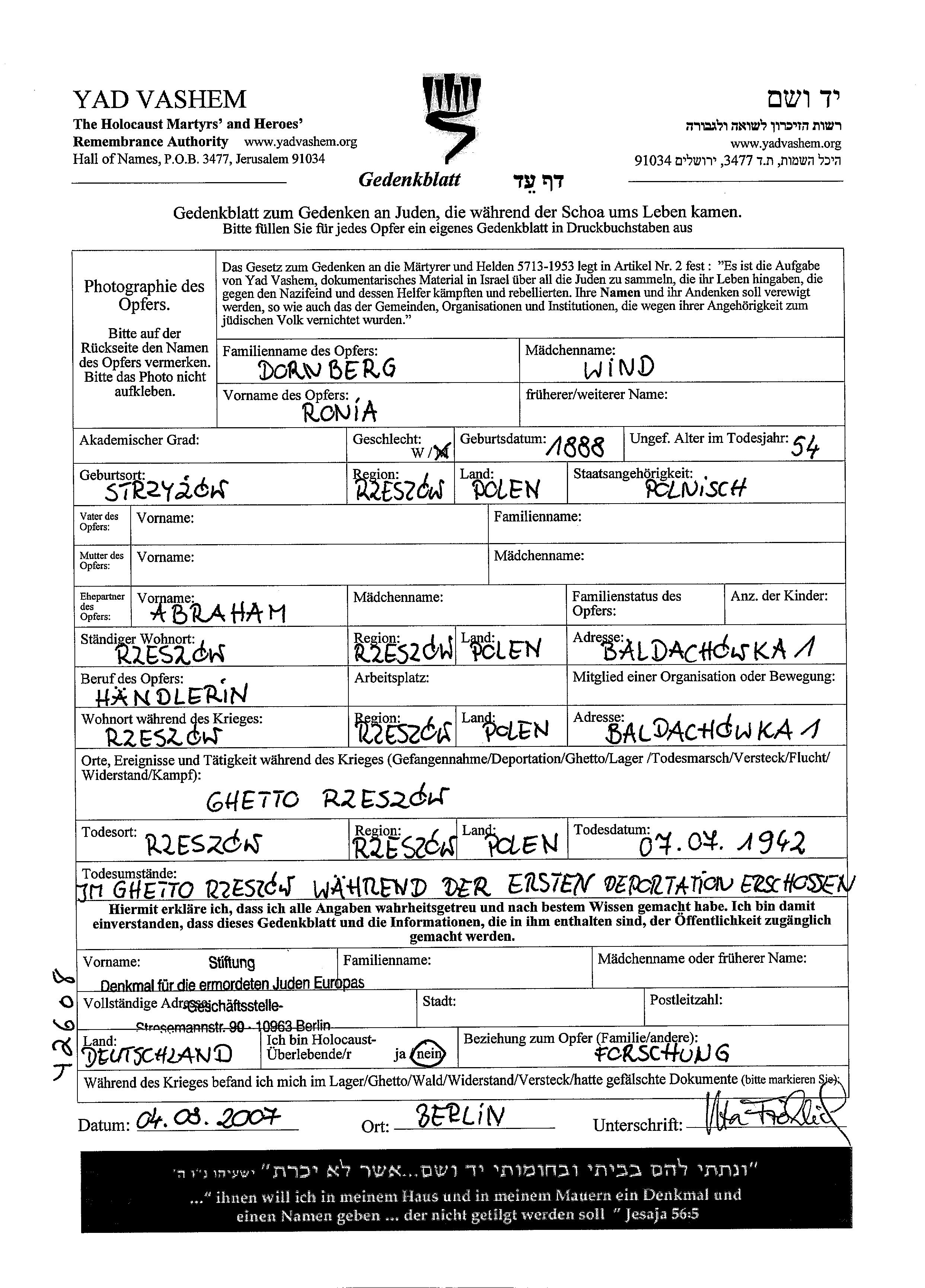Ronia Dornberg nee Vind was born in Strzyzow, Poland, 1888. She was a merchant. Prior to WWII she lived in Poland.