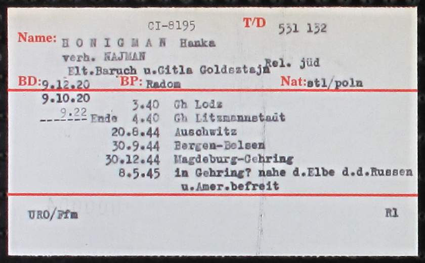 Honigman Najmann Hanka 1922 Lodz, Poland ITS card file