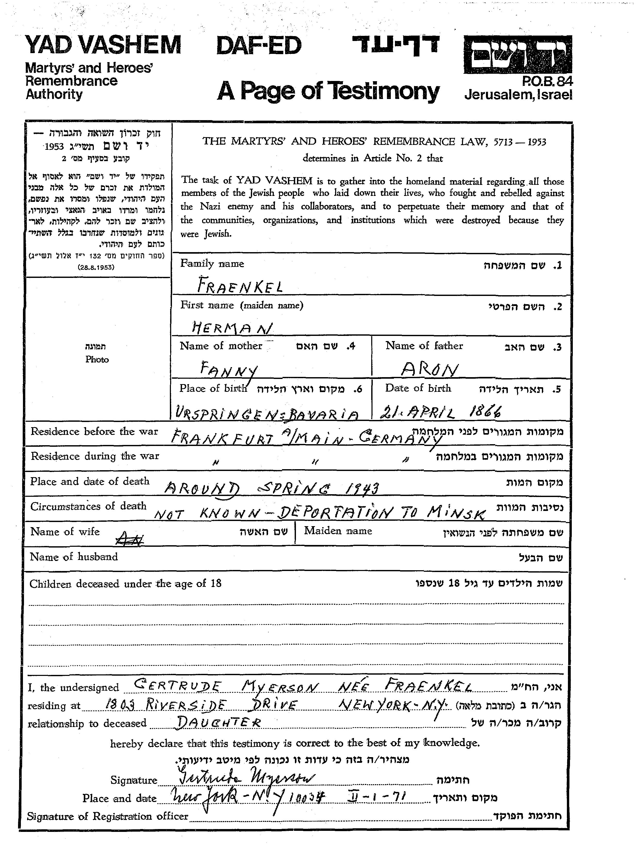 Fraenkel Herman 1866 Frankfurt am Main, Germany Page of Testimony
