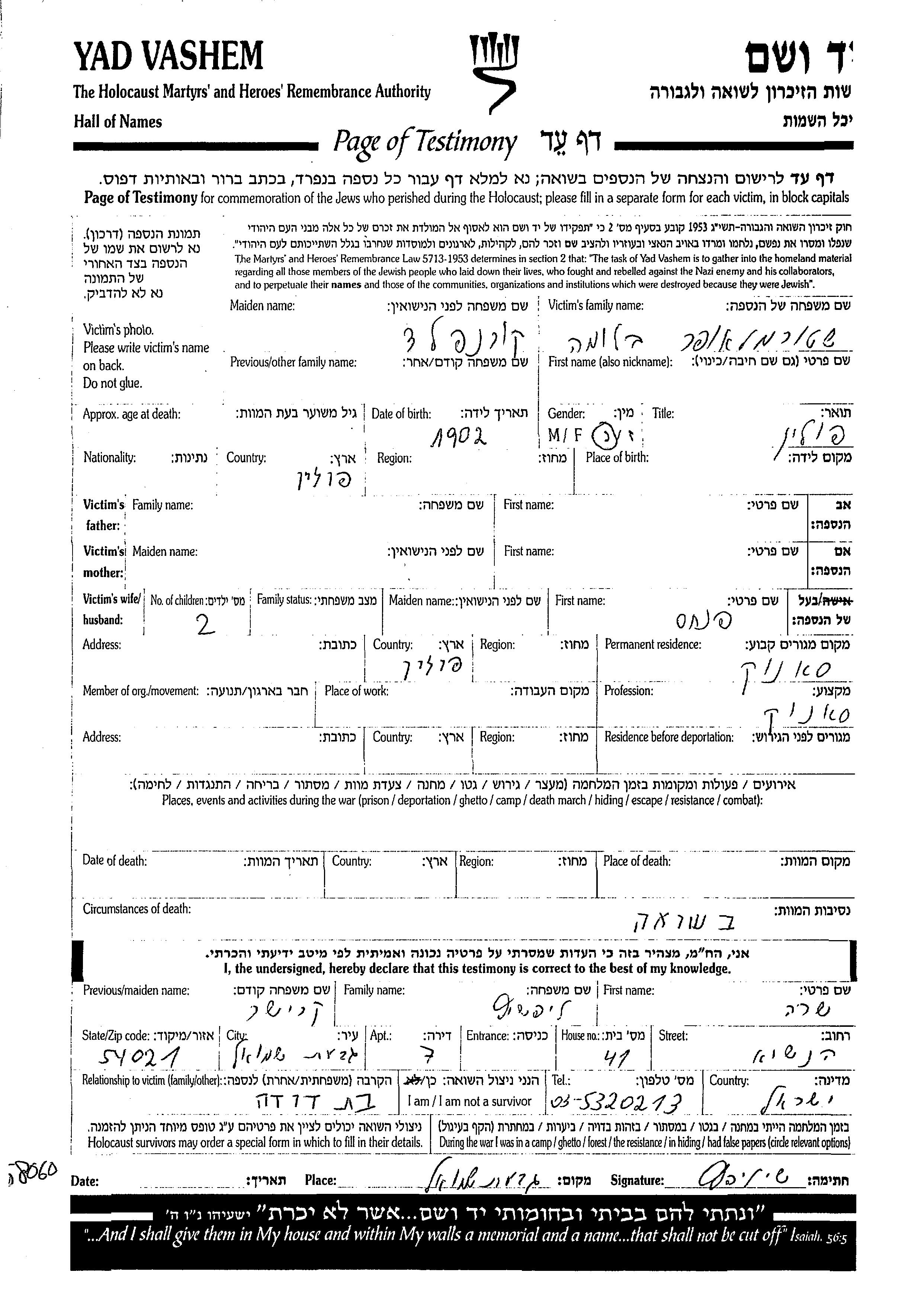 | Shturemlaufer | Bluma | 1902 | Sanok, Poland | Page of Testimony |