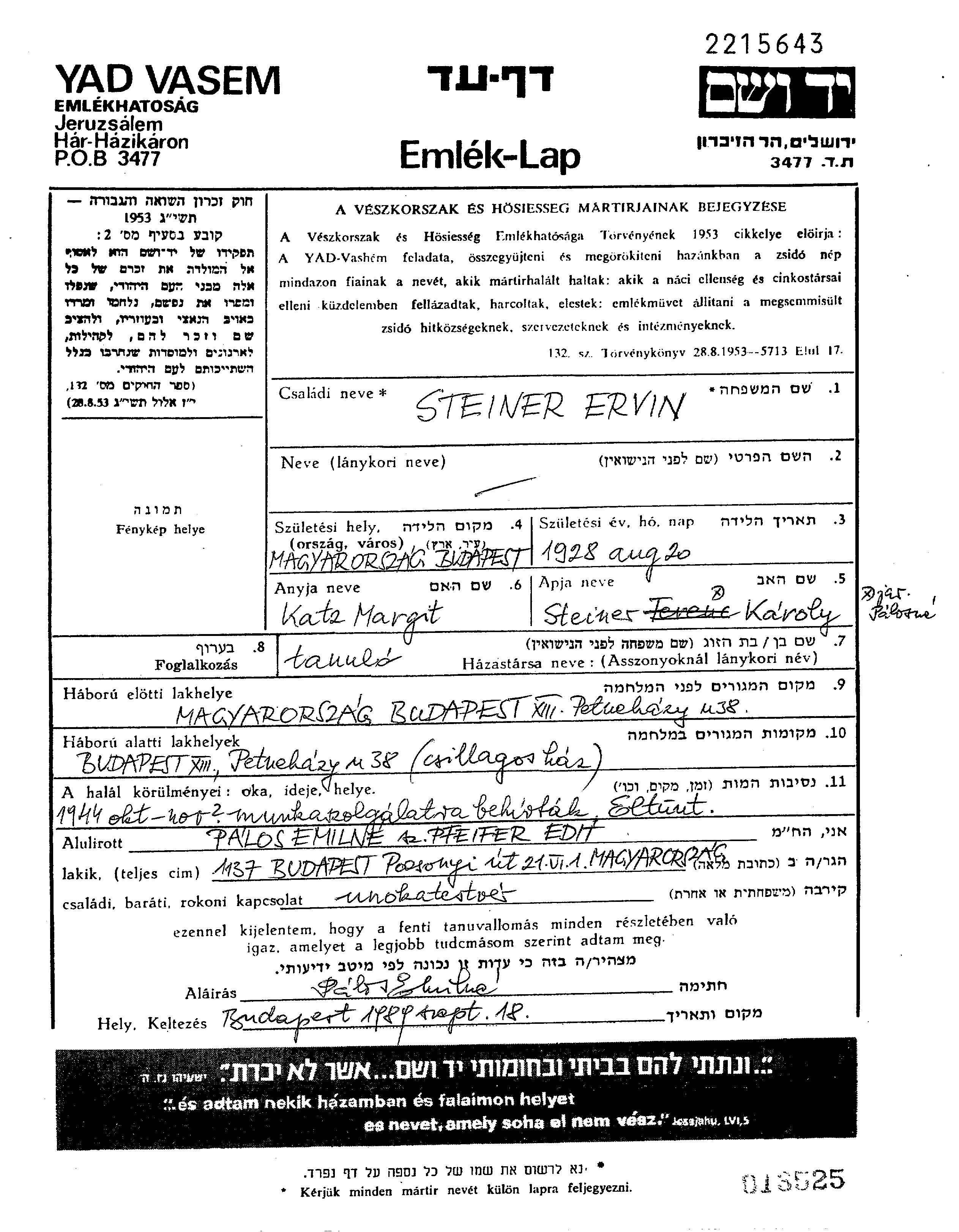 | Steiner | Ervin | 1928 | Budapest, Hungary | Page of Testimony |