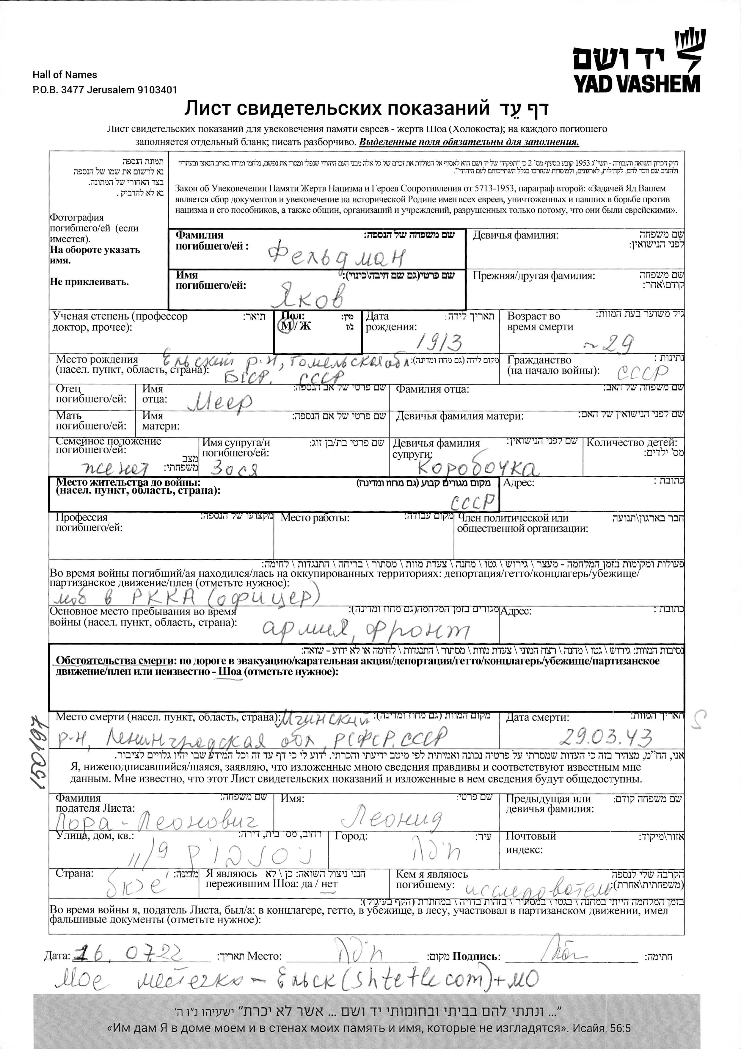 Feldman Yakov 1913 unstated place, Page of Testimony