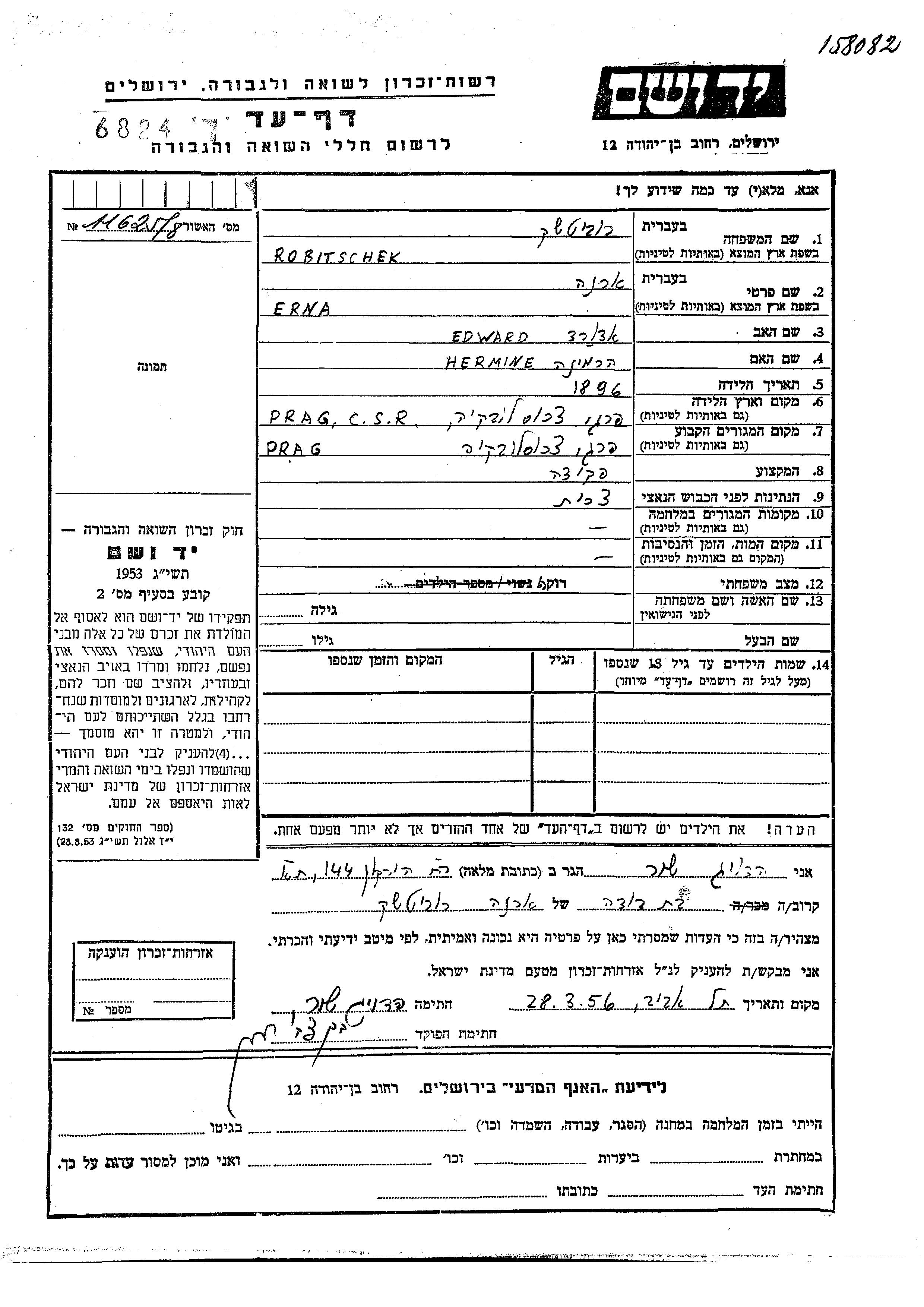 | Robitschek | Erna | 1896 | Prague, Czechoslovakia | Page of Testimony |
