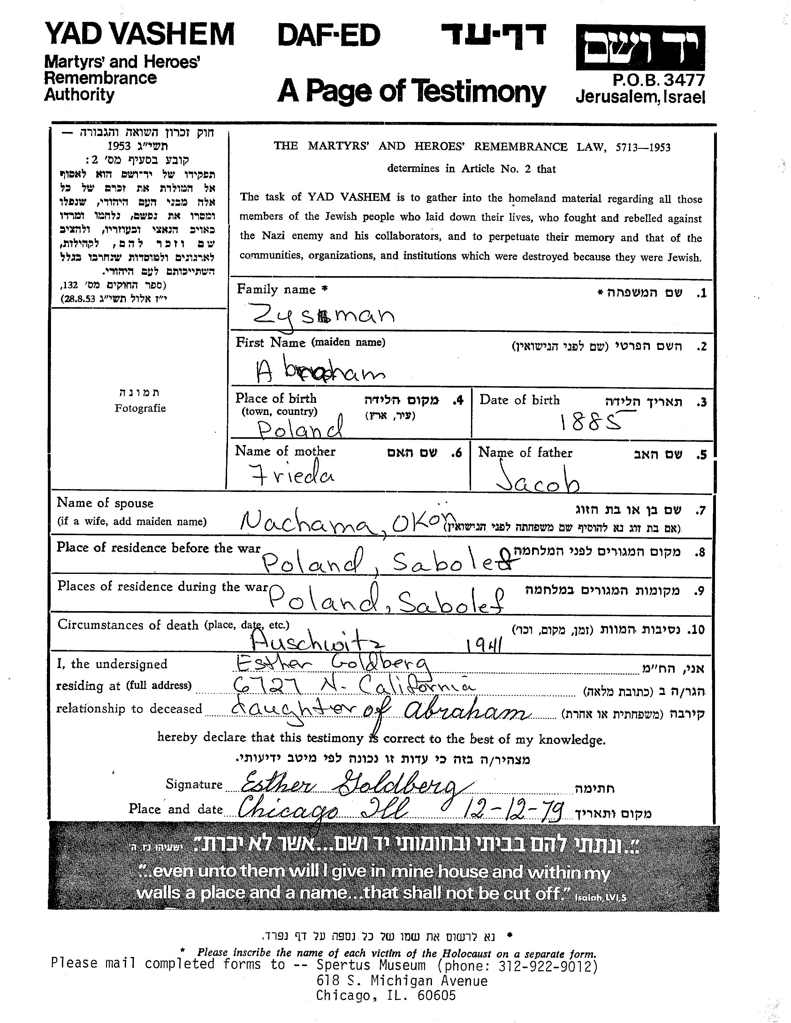 Abraham Zysman was born in Poland, 1885 to Jacob and Frieda. He was married to Nachama nee Okun. Prior to WWII he lived in Sobolew, Poland. During the war he was in Sobolew, Poland. Abraham was murdered in the Shoah. Place of death: Auschwitz, Poland, 1941.