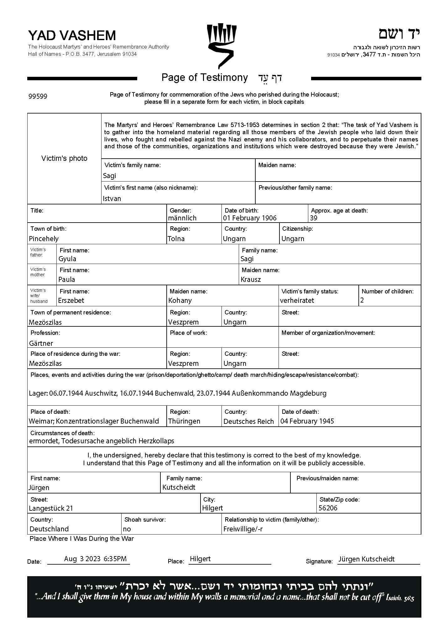 | Sagi | Istvan | 1906 | Mezoszilas, Hungary | Page of Testimony (digital) |