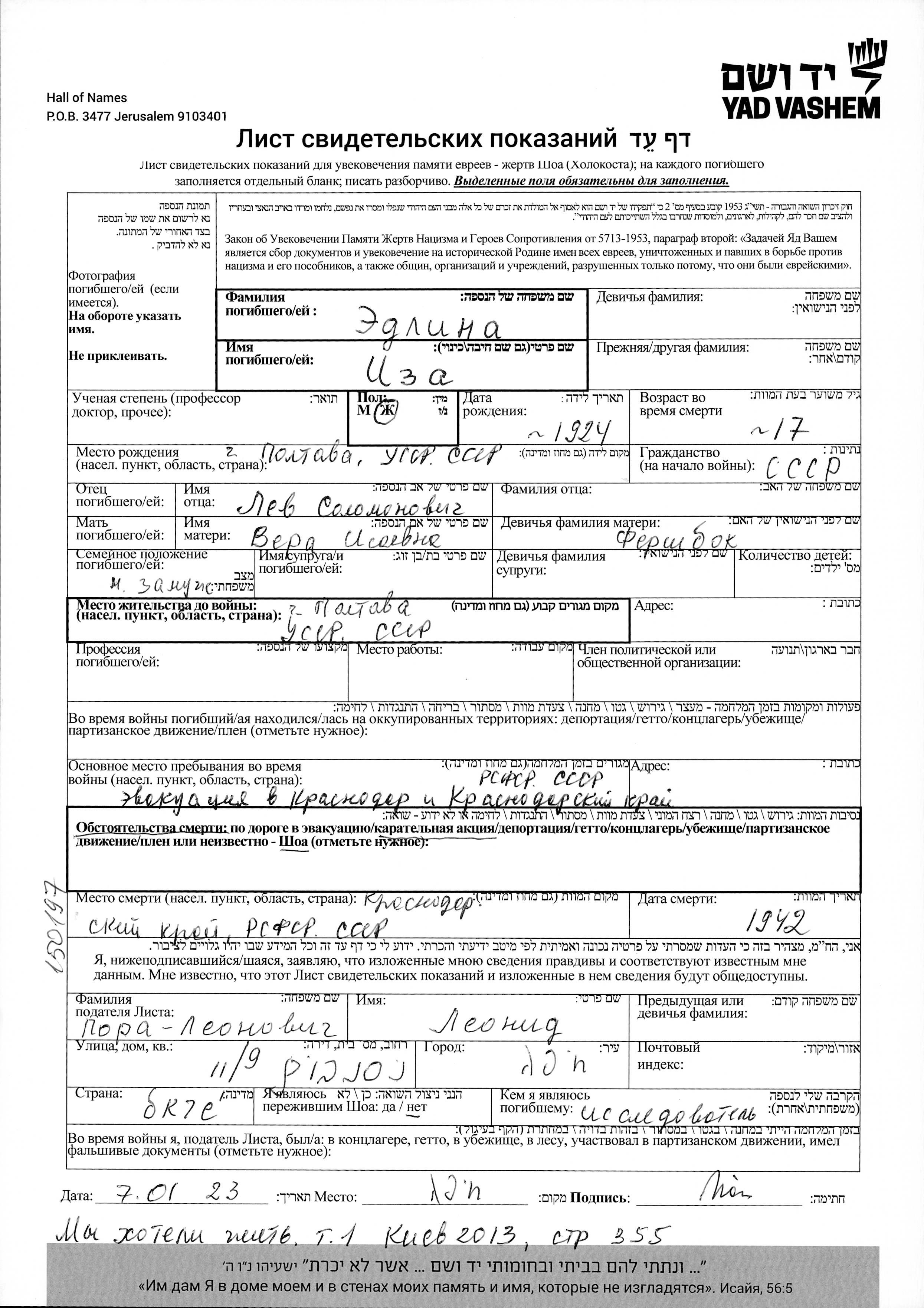 | Edlina | Iza | Poltava, Ukraine (USSR) | Page of Testimony | |