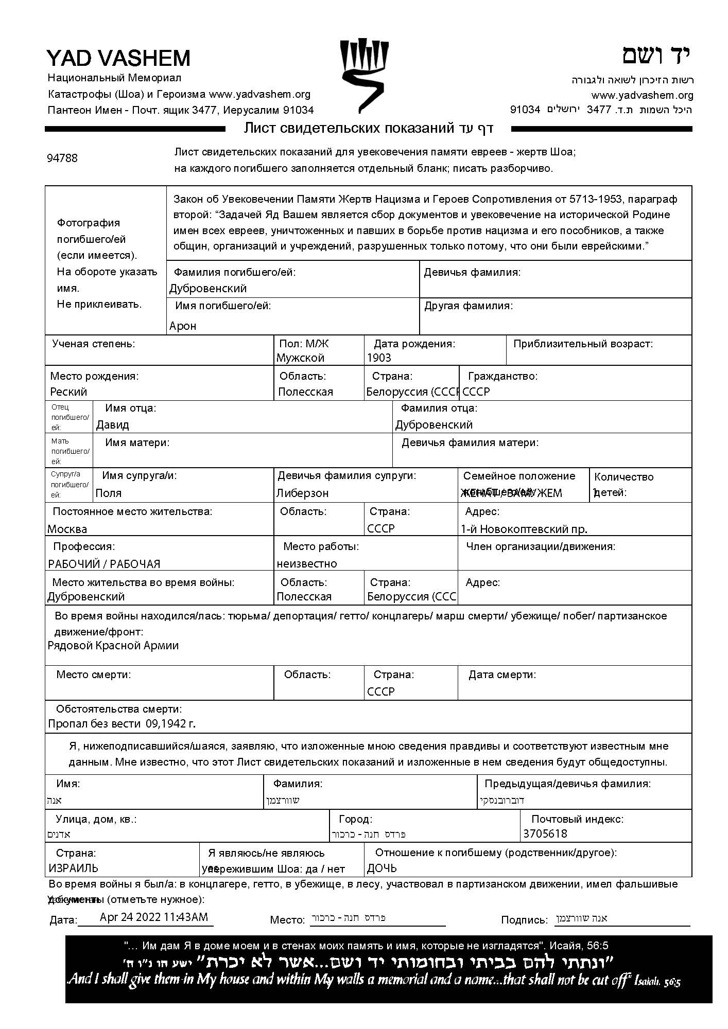 Dubrovenski Aron 1903 Moskva, Russia (USSR) Page of Testimony (digital)