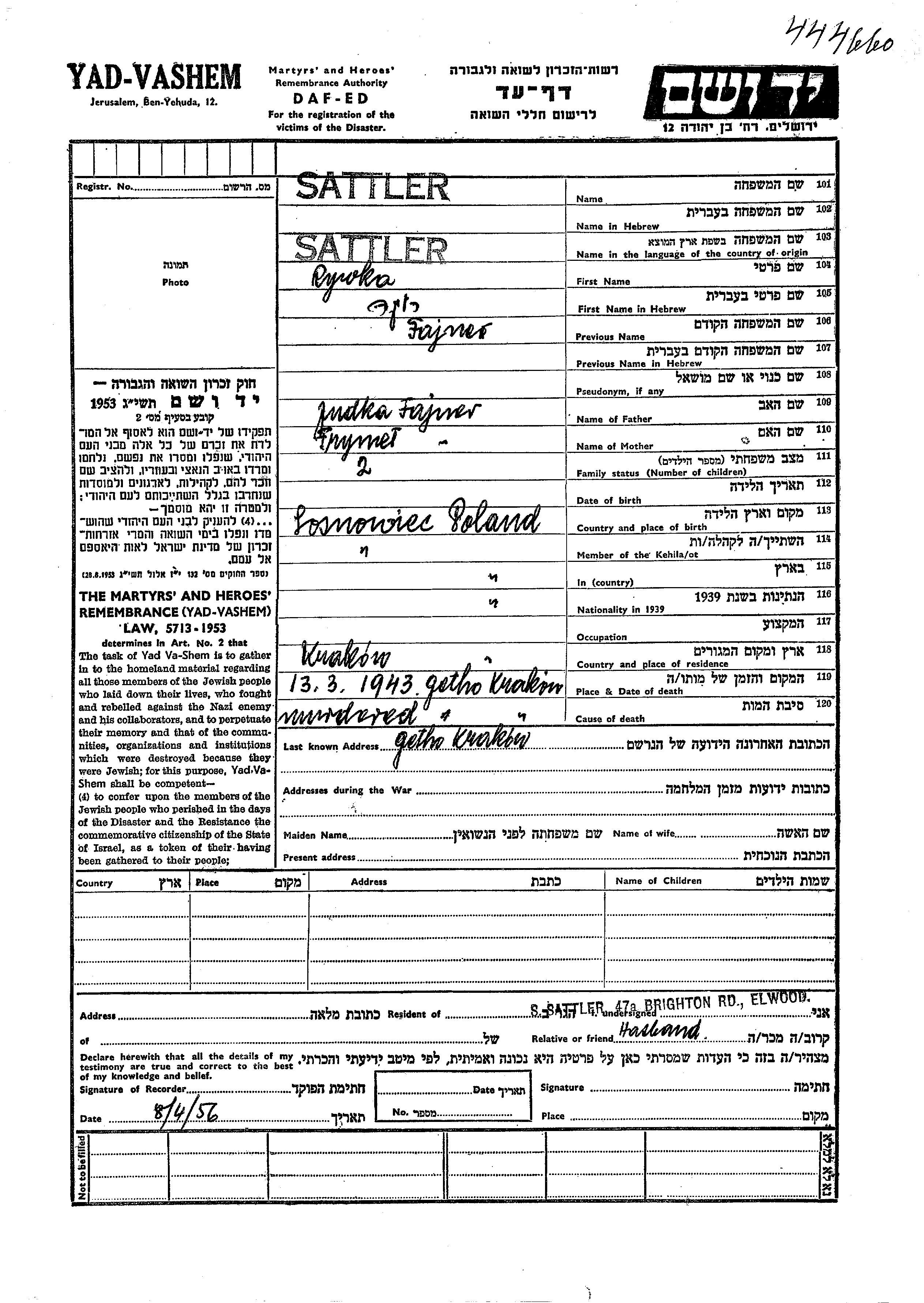 Rywka Roka Satler nee Fajner was born in Sosnowiec, Poland to Judka and Frymet. She was married. Prior to WWII she lived in Krakow, Poland. During the war she was in Krakow, Poland.