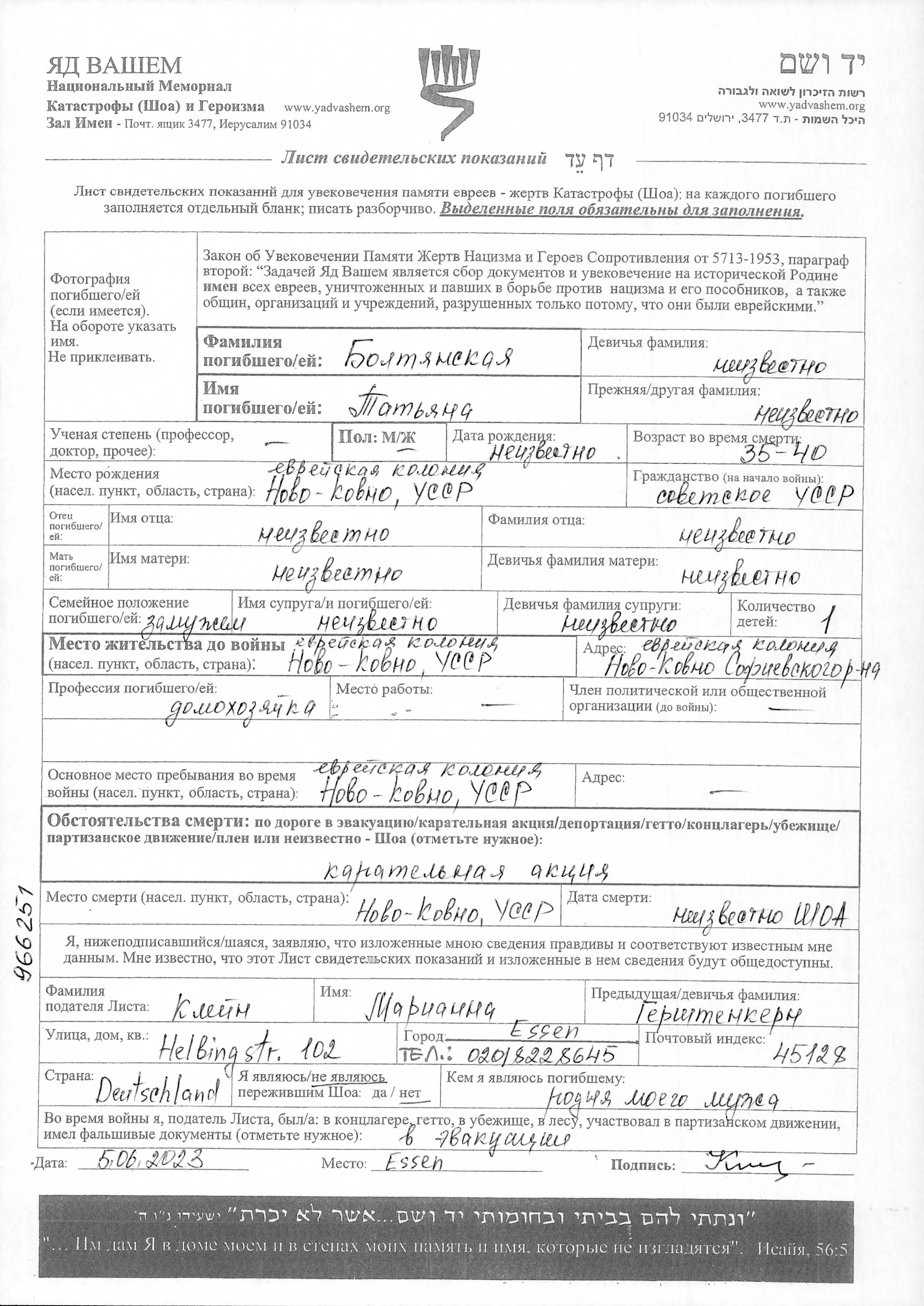 Boltyanskaya Tatiyana Novo Kovno, Ukraine (USSR) Page of Testimony