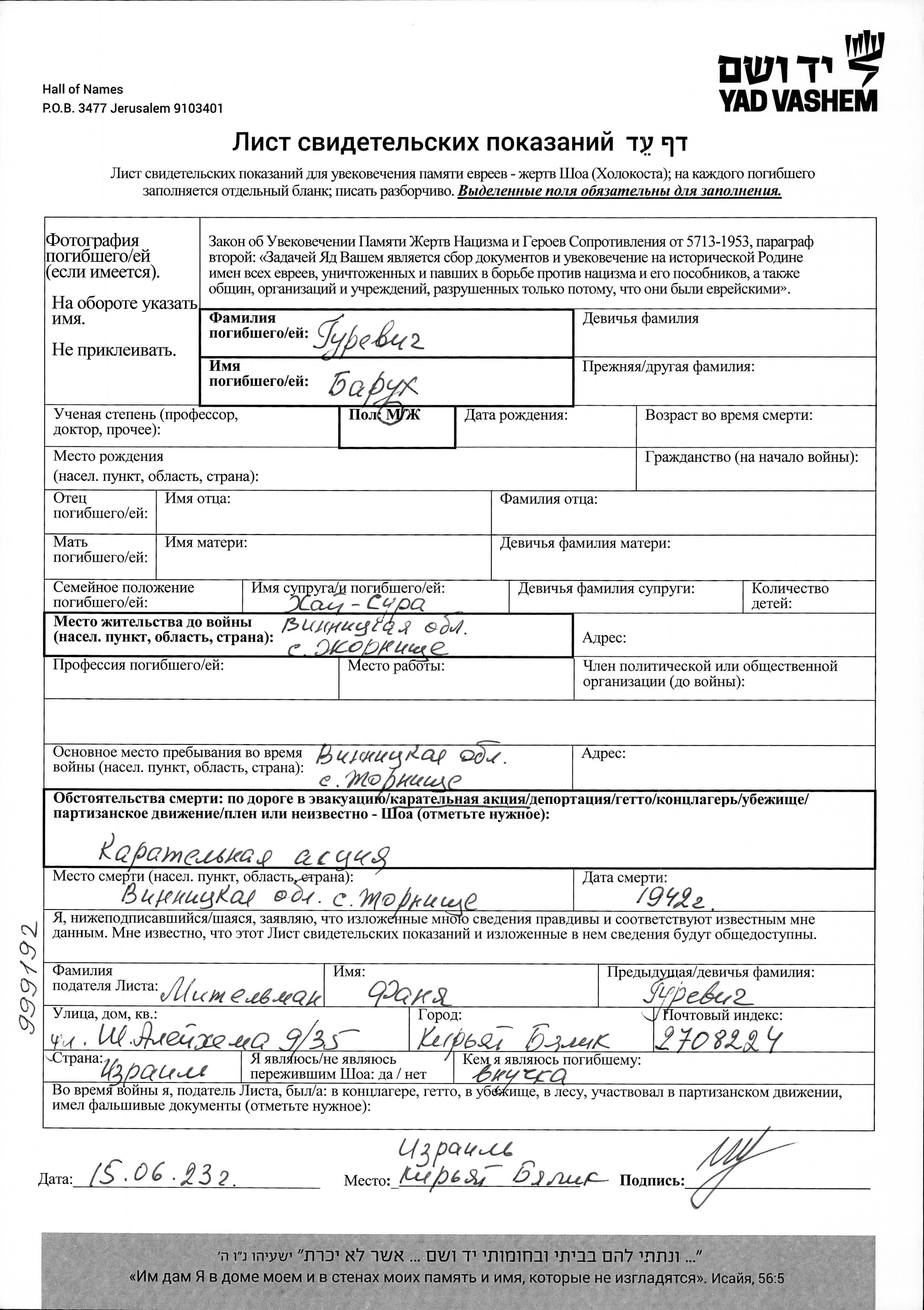 Gurevich Barukh Zhornishche, Ukraine (USSR) Page of Testimony