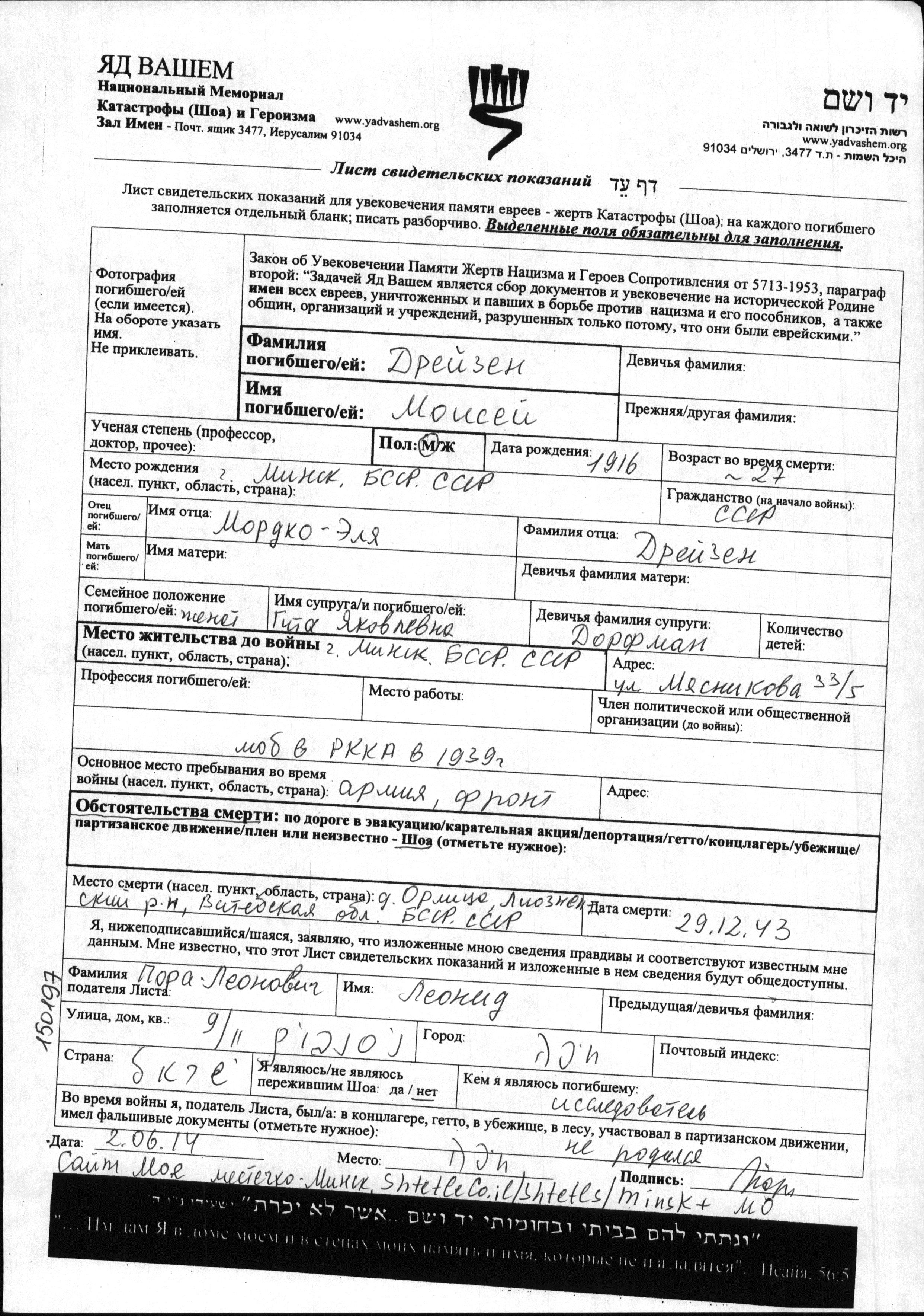 Dreyzen Moisey 1916 Minsk, Belorussia (USSR) Page of Testimony