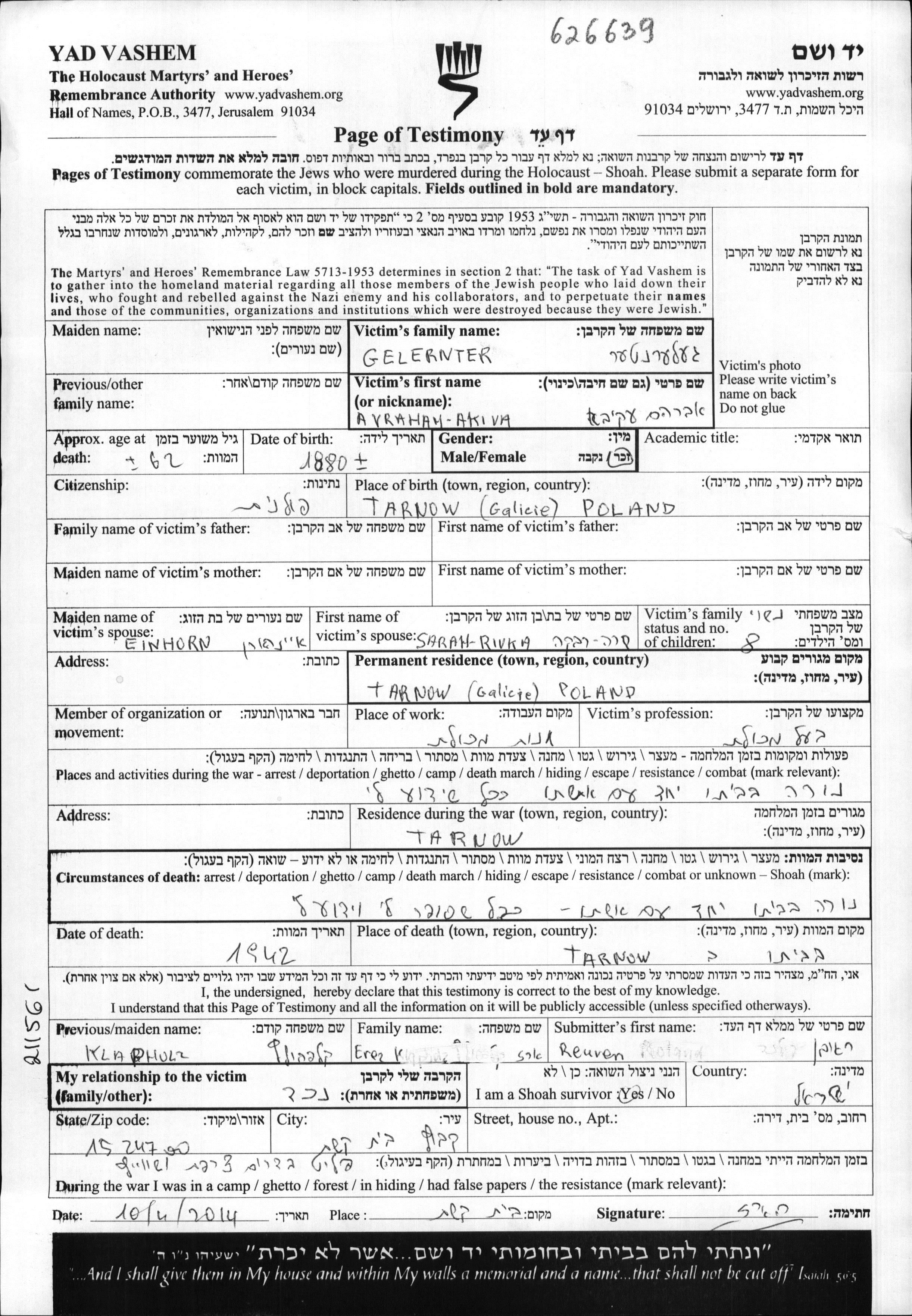 Gelernter Avraham Akiva 1880 Tarnow, Poland Page of Testimony