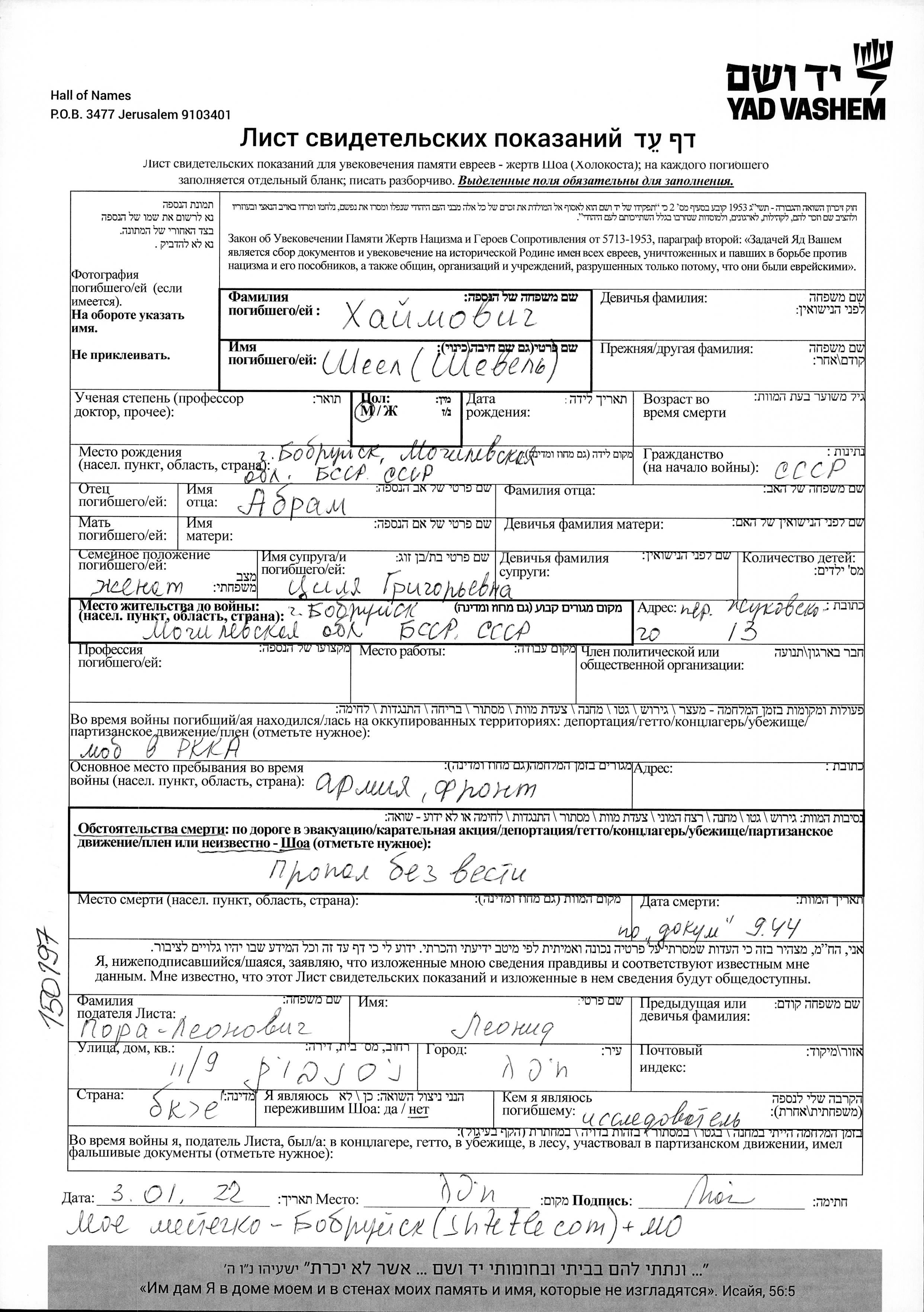 Khaymovich Sheel Bobruysk, Belorussia (USSR) Page of Testimony