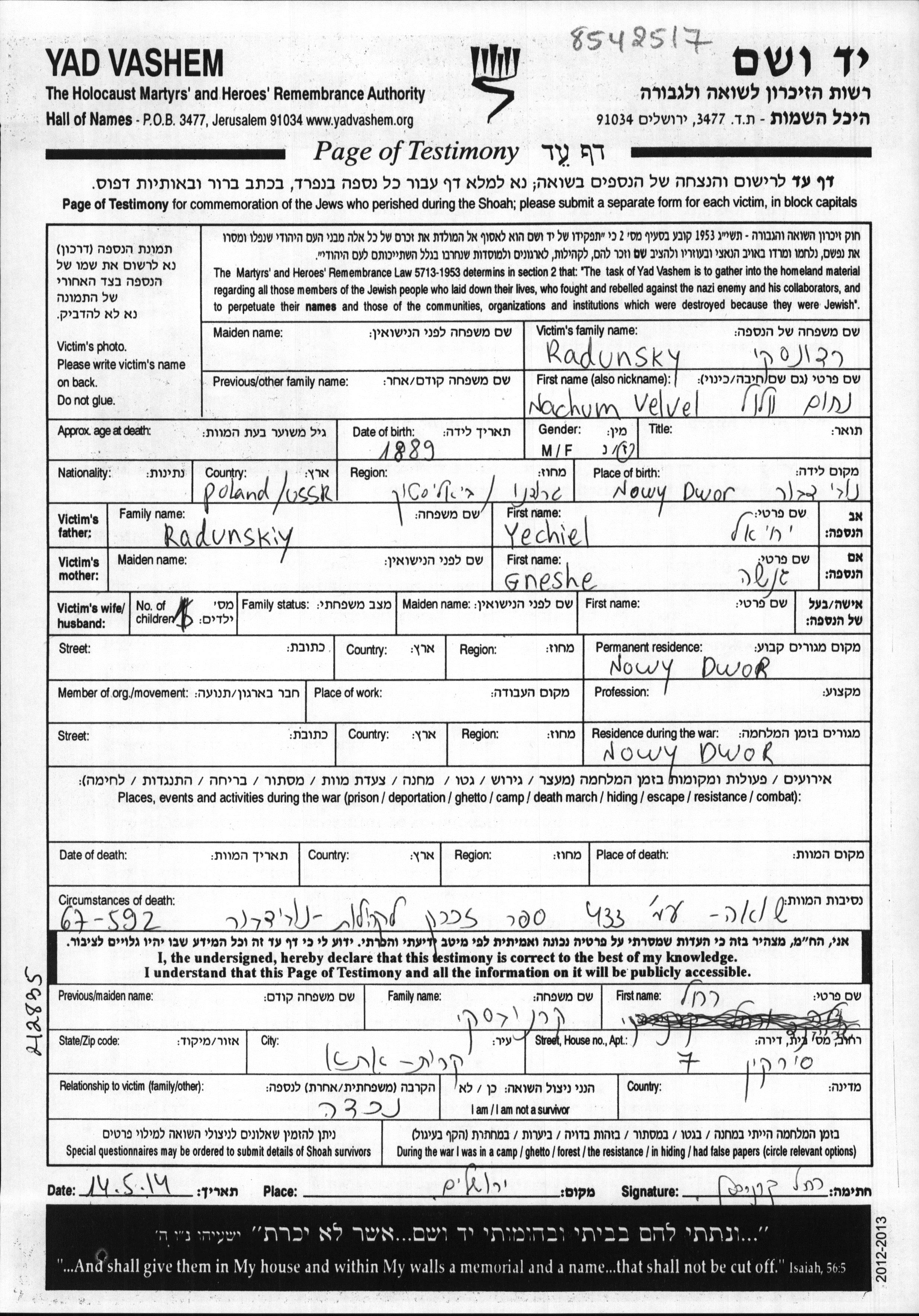 Radunsky Nachum Velvel 1889 Nowy Dwor, Poland Page of Testimony
