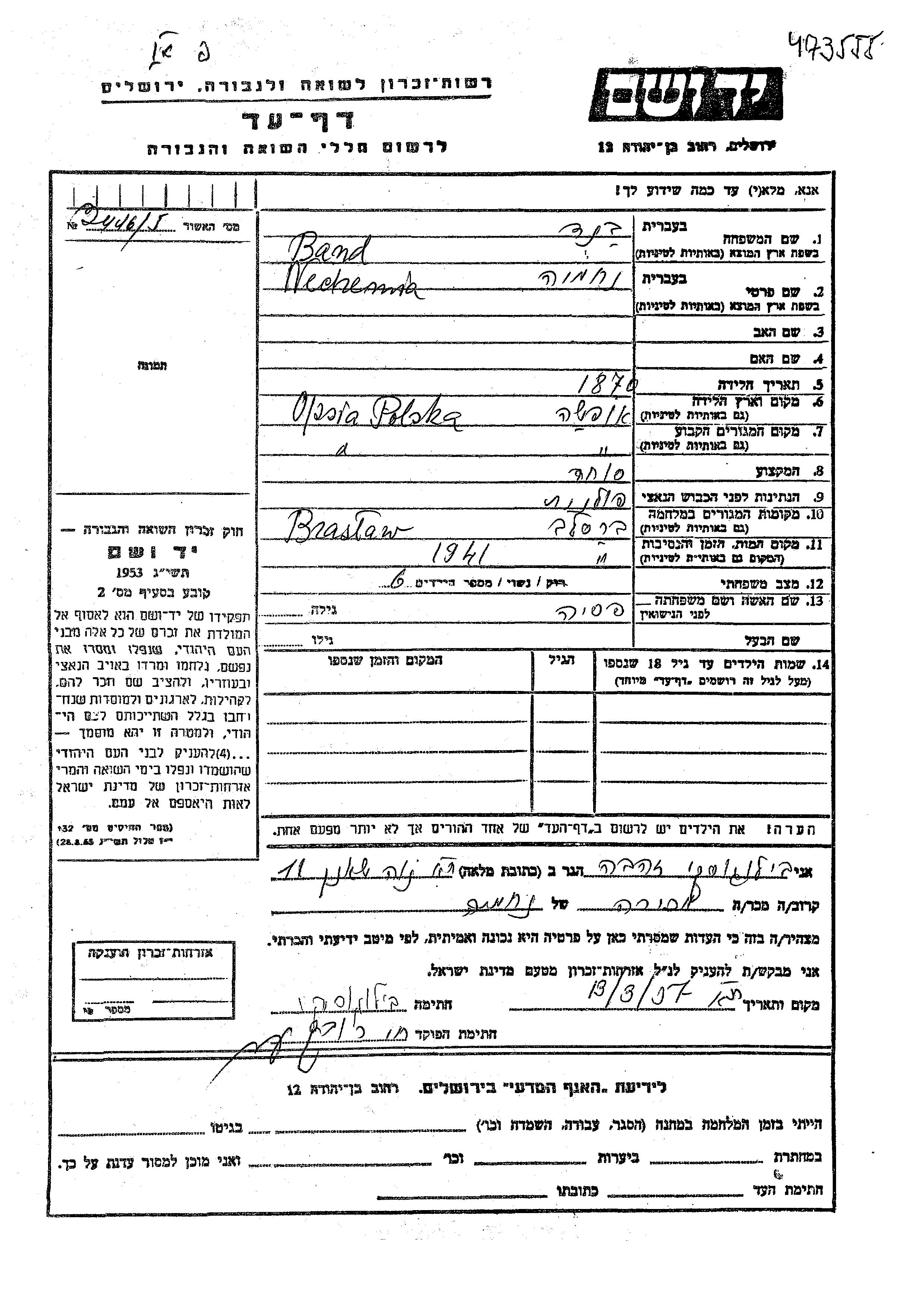 Nechemia Band was born in Opsa, Poland, 1870. He was a merchant. Prior to WWII he lived in Opsa, Poland.