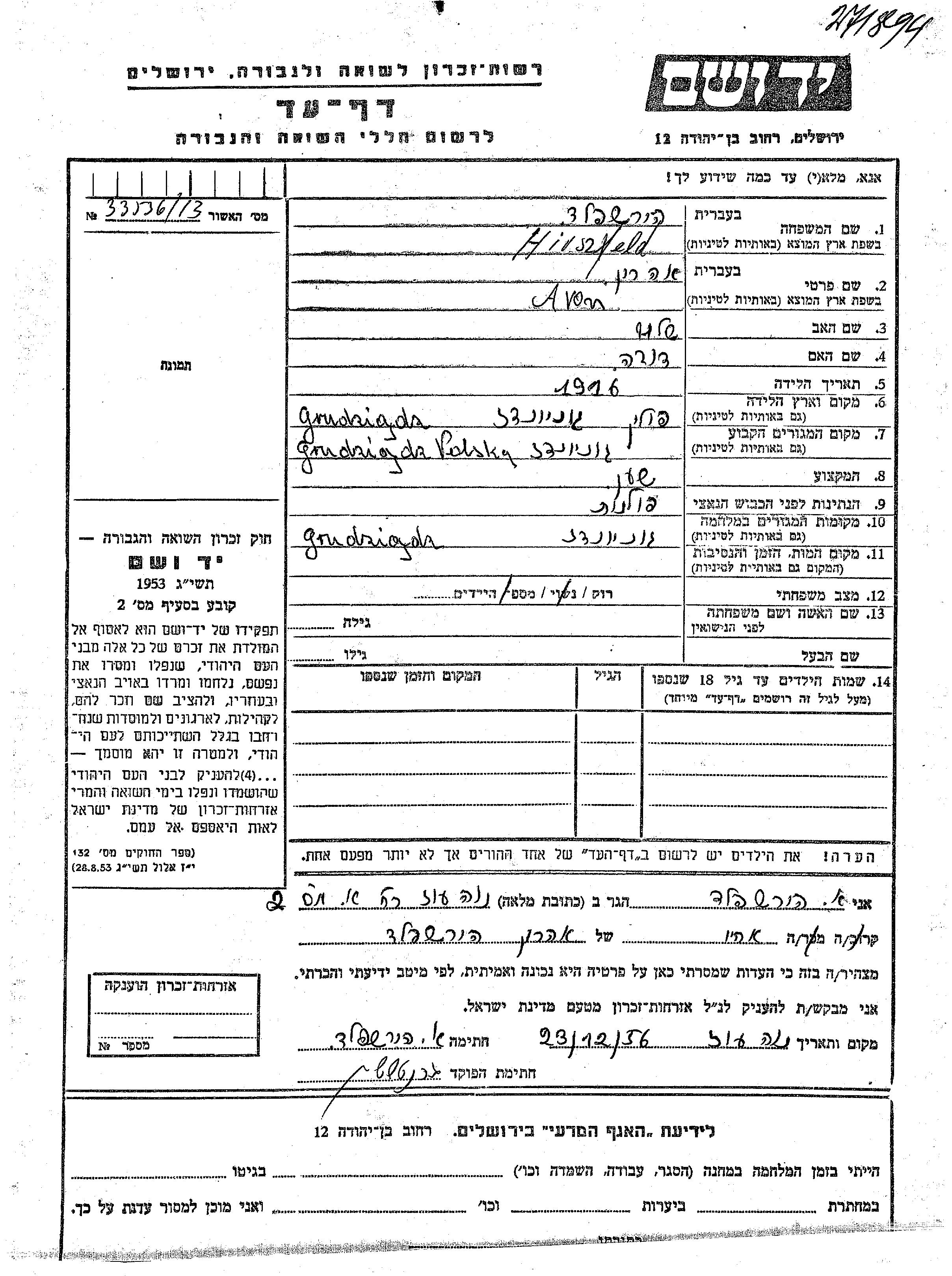 Aron Hirszfeld was born in Grudziadz, Poland, 1916 to Shalom and Doba. He was a watchmaker and single. Prior to WWII he lived in Grudziadz, Poland. During the war he was in Grudziadz, Poland. Aron was murdered in the Shoah.