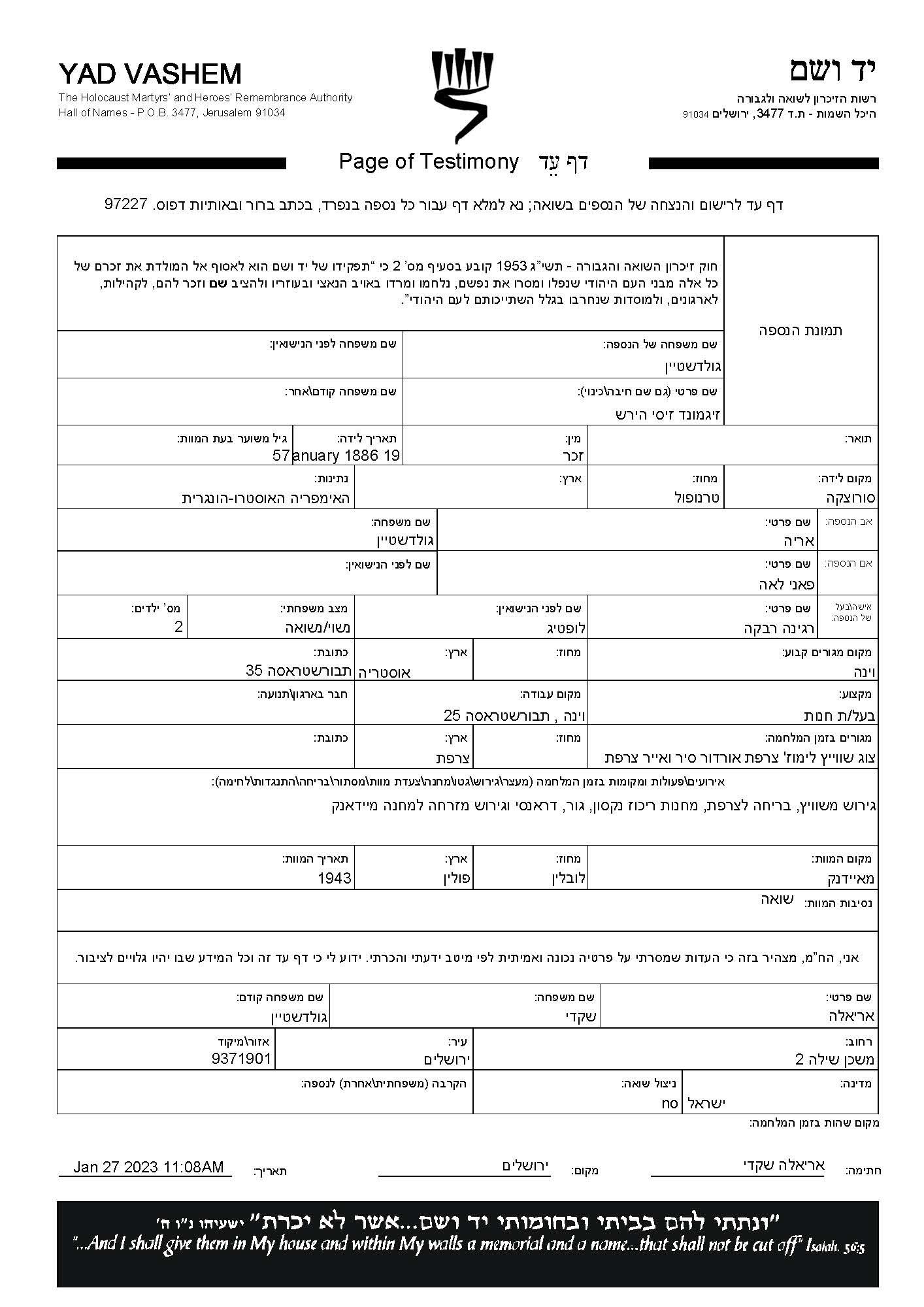 Goldshtein Zigmund Zisi Hirsh 1886 Wien, Austria Page of Testimony (digital)