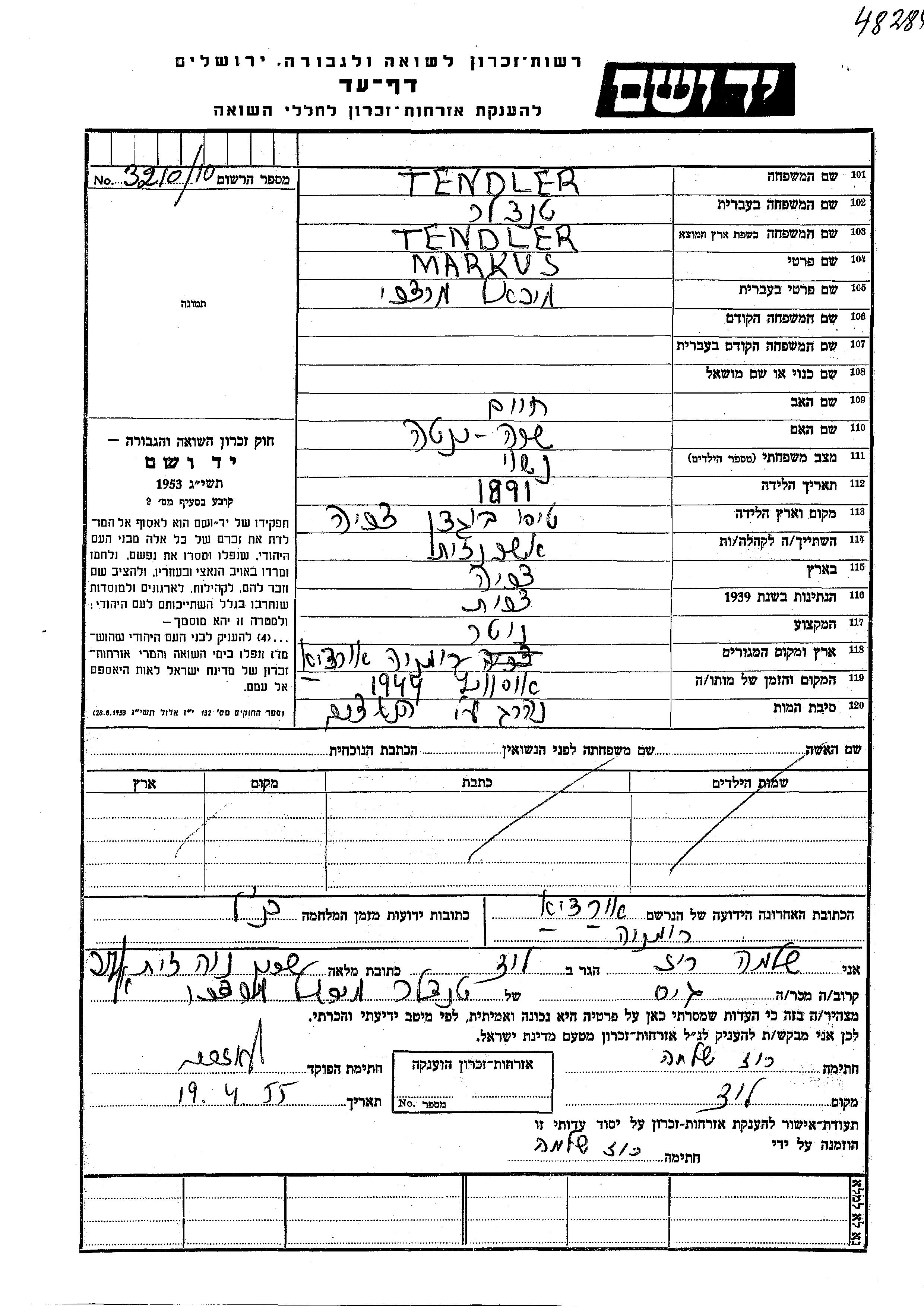 Mikhael Mordekhai Markus Tendler was born in Bohdan, Czechoslovakia, 1891 to Khaim and Sara Yenta. He was a נוטר and married. Prior to WWII he lived in Oradea, Romania. During the war he was in Oradea, Romania.