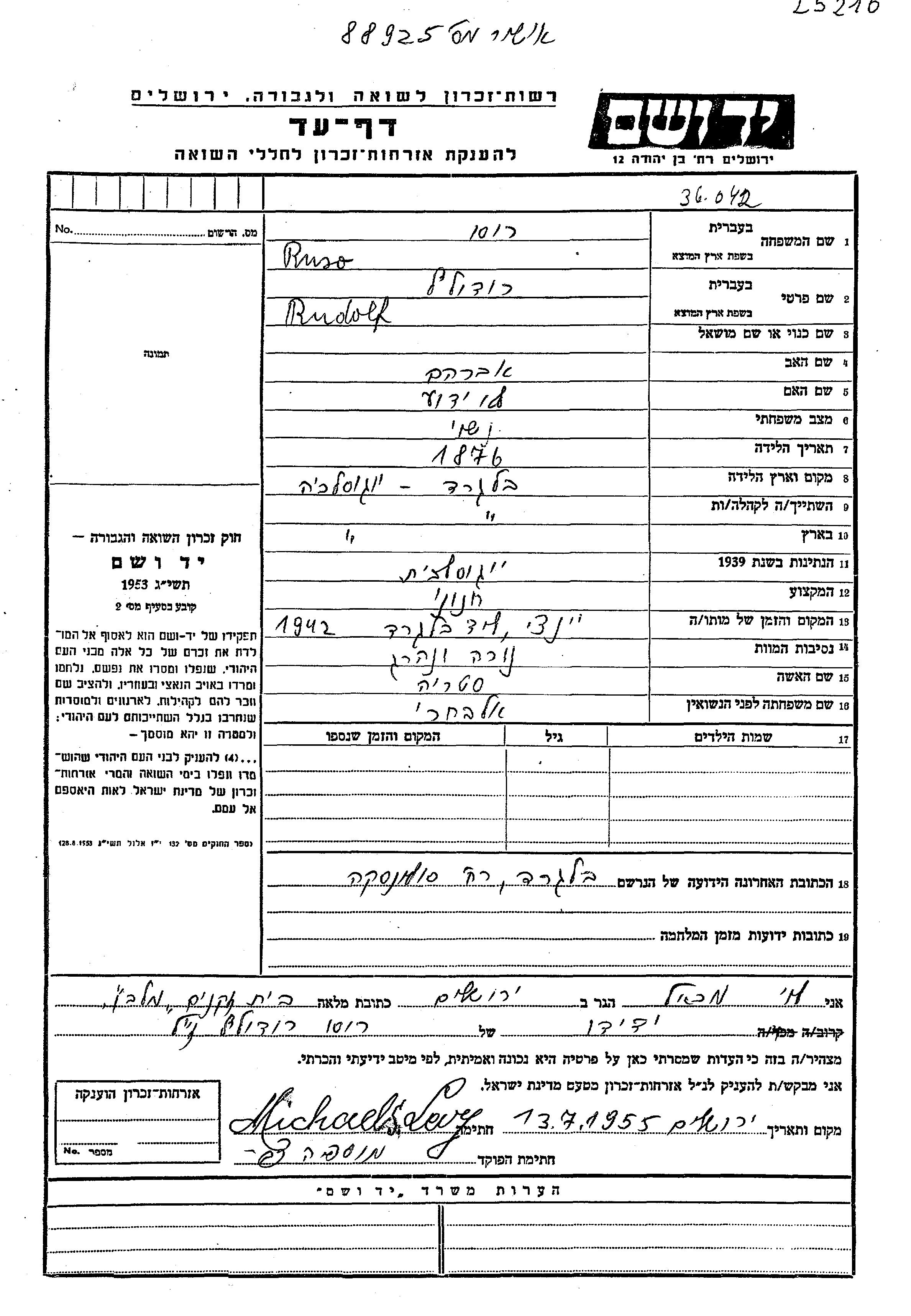 Rudolf Ruso was born in Belgrad, Yugoslavia, 1876 to Avraham. He was a grocer and married to Straya nee Albakhari. Prior to WWII he lived in Belgrad, Yugoslavia. During the war he was in Belgrad, Yugoslavia. Rudolf was murdered in the Shoah. Place of death: Belgrade, Yugoslavia, 1942.