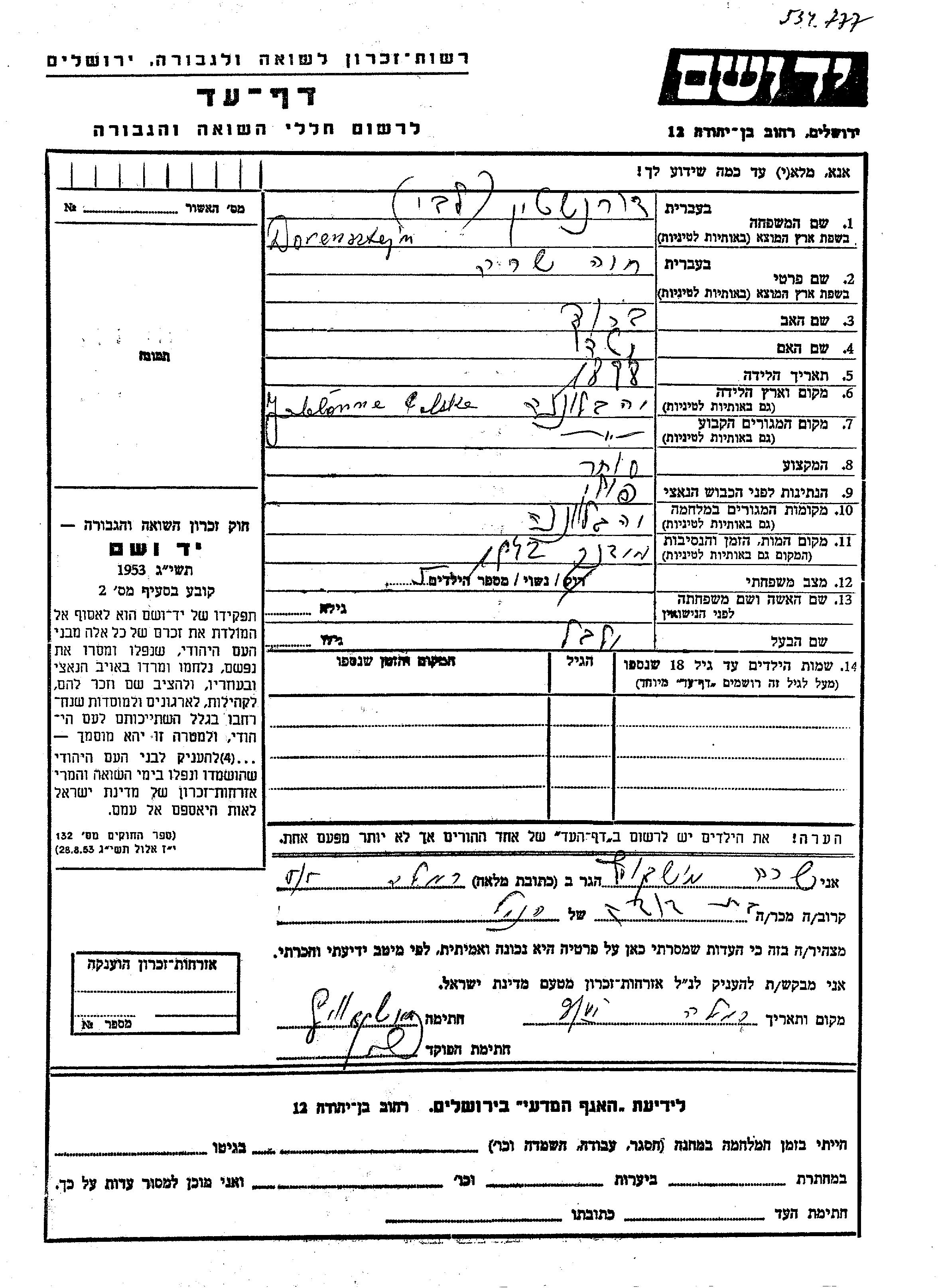 Khava Sara Dorensztejn nee Labi was born in Jablonna, Poland, 1898 to Barukh and Neta. She was a merchant and married to Velvel. Prior to WWII she lived in Jablonna, Poland. During the war she was in Jablonna, Poland. Khava Sara was murdered in the Shoah. Place of death: Majdanek, Poland, 1942.