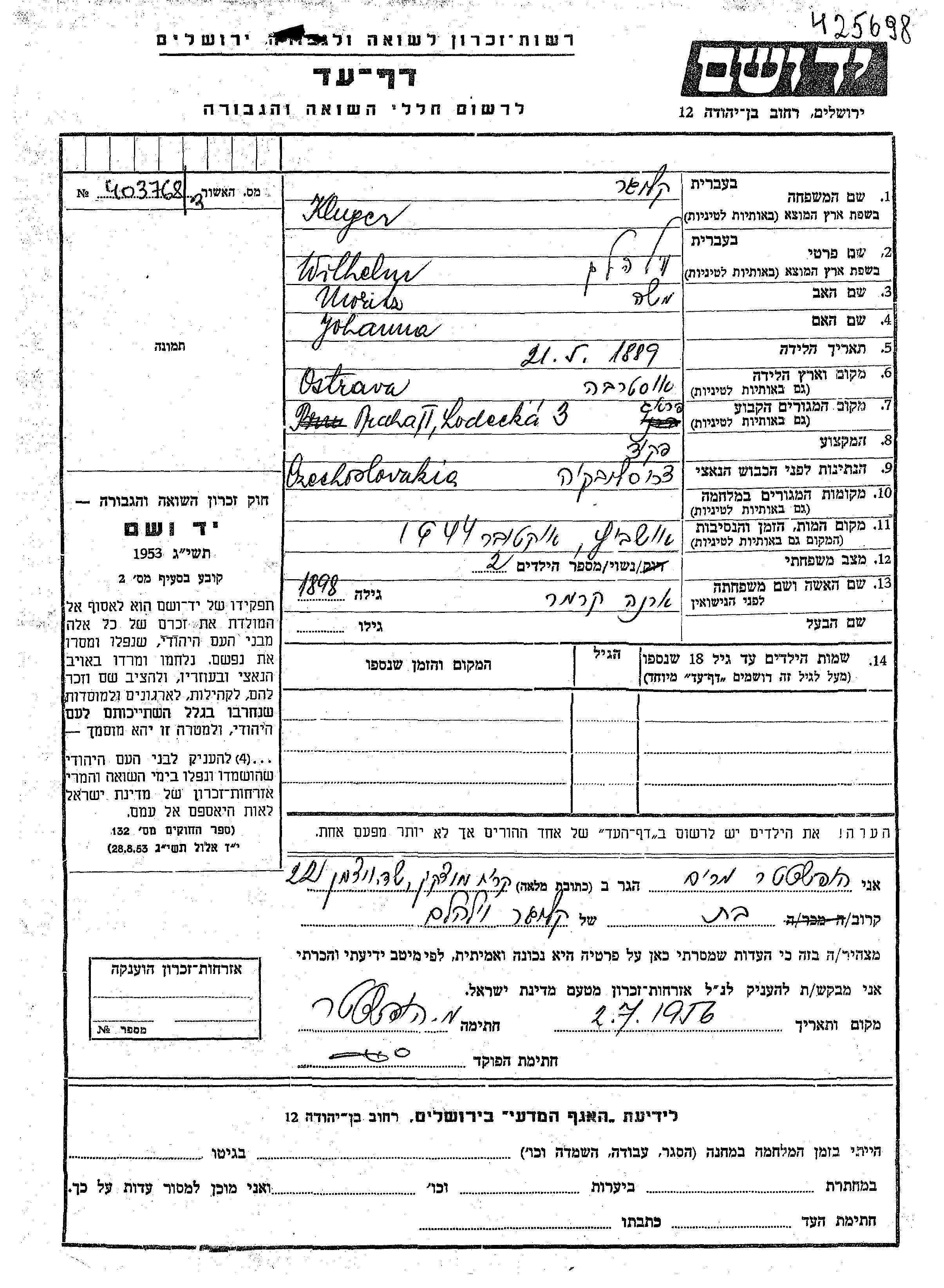 Wilhelm Kluger was born in Ostrava, Czechoslovakia, 1889 to Moritz Moshe and Johanna. He was a clerk and married to Erna nee Kremer. Prior to WWII he lived in Praha, Czechoslovakia. During the war he was in Czechoslovakia. Wilhelm was murdered in the Shoah. Place of death: Auschwitz, Poland, 10/1944.