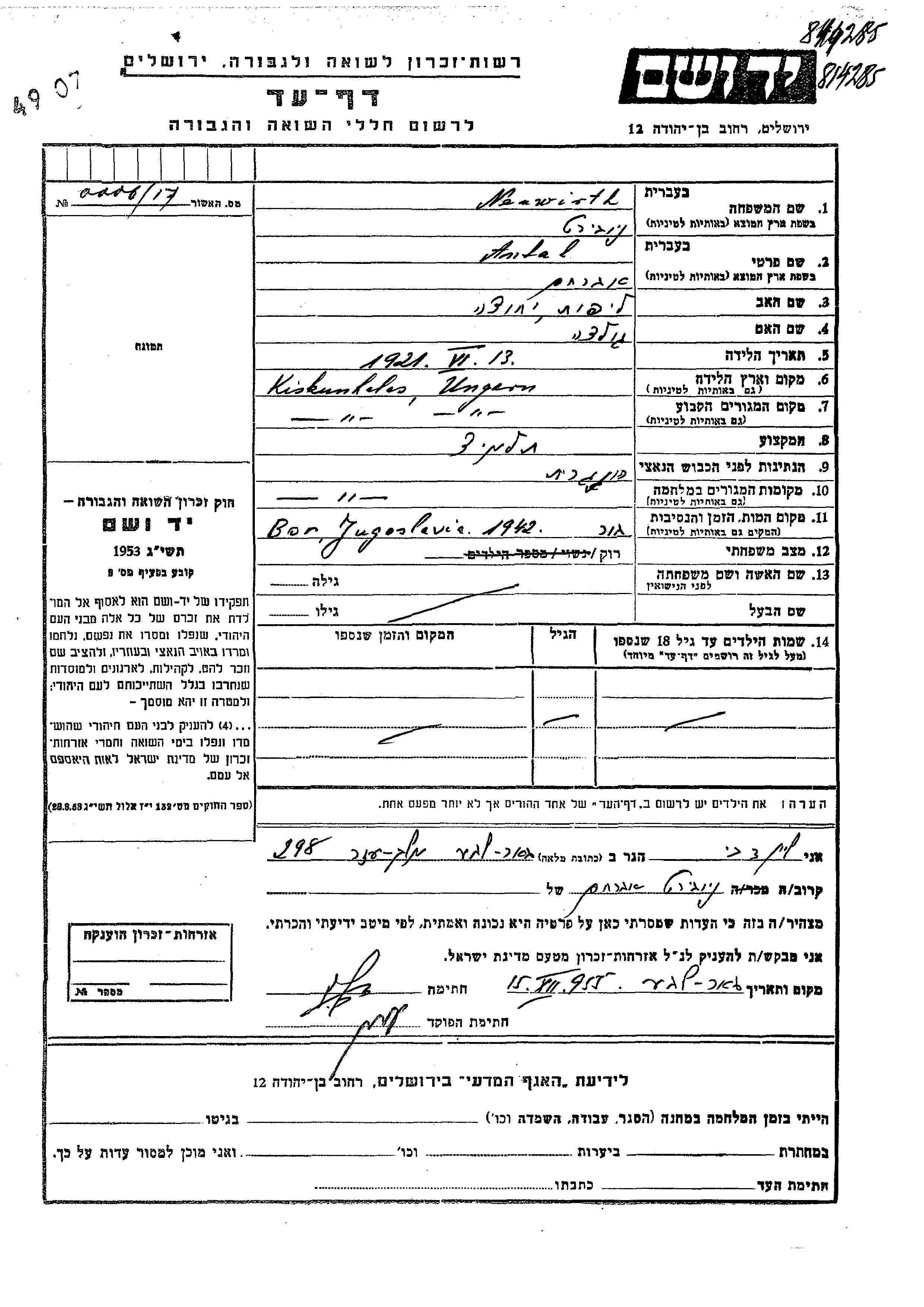 Neuwirth Antal Avraham 1921 Kiskunhalas, Hungary Page of Testimony