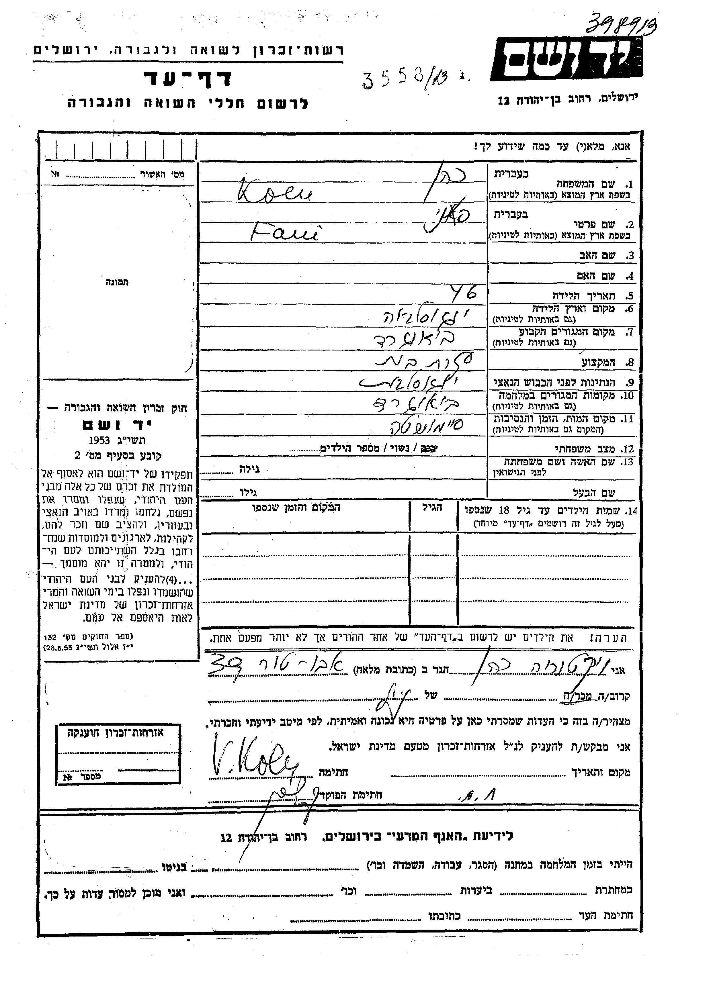 Koen Fani Beograd, Yugoslavia Page of Testimony