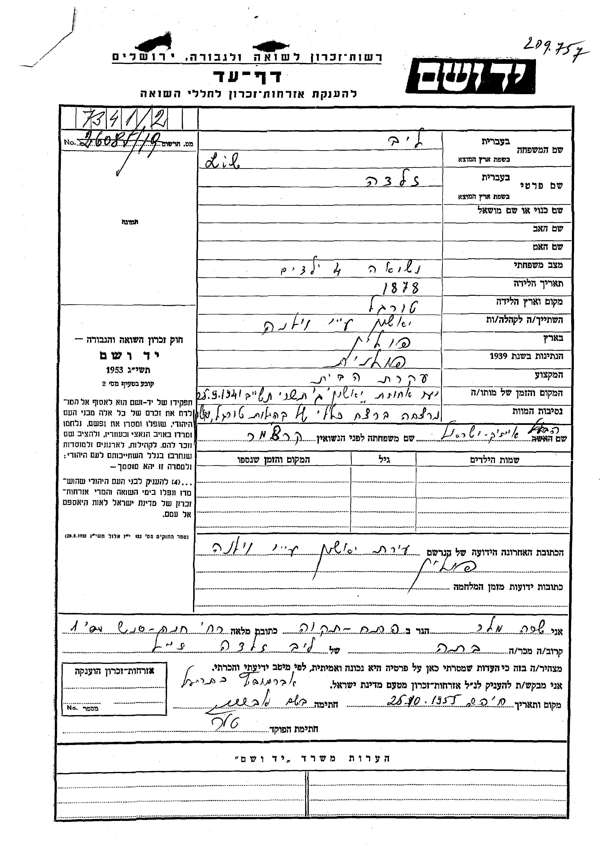 Zelda Lib nee Krechmer was born in Turgiele, Poland, 1878. She was a housewife. Prior to WWII she lived in Jaszuny, Poland. Zelda was murdered in the Shoah. Place of death: Jaszuny, Poland, 25/09/1941.