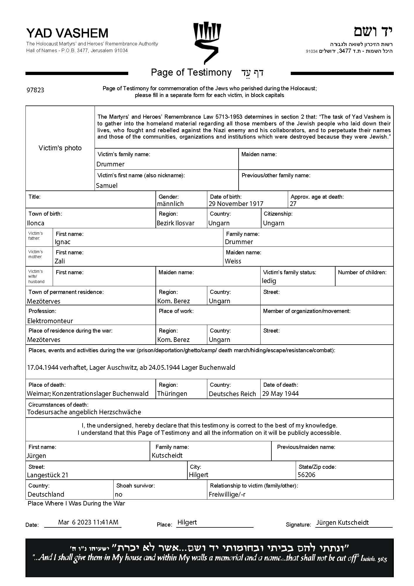 Drummer Samuel 1917 Mezoterebes, Czechoslovakia Page of Testimony (digital)