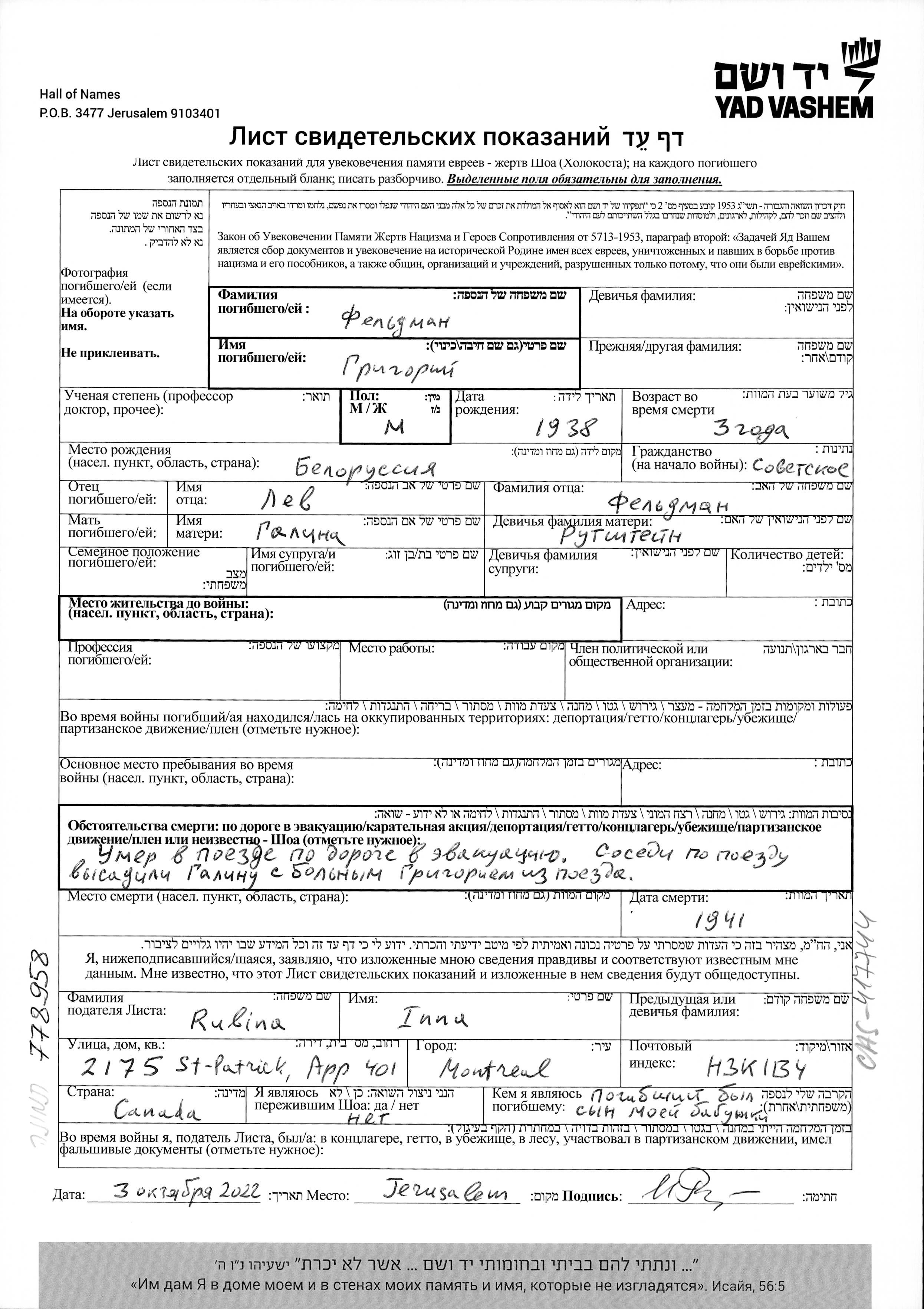 Feldman Grigoriy 1938 Soviet Union Page of Testimony