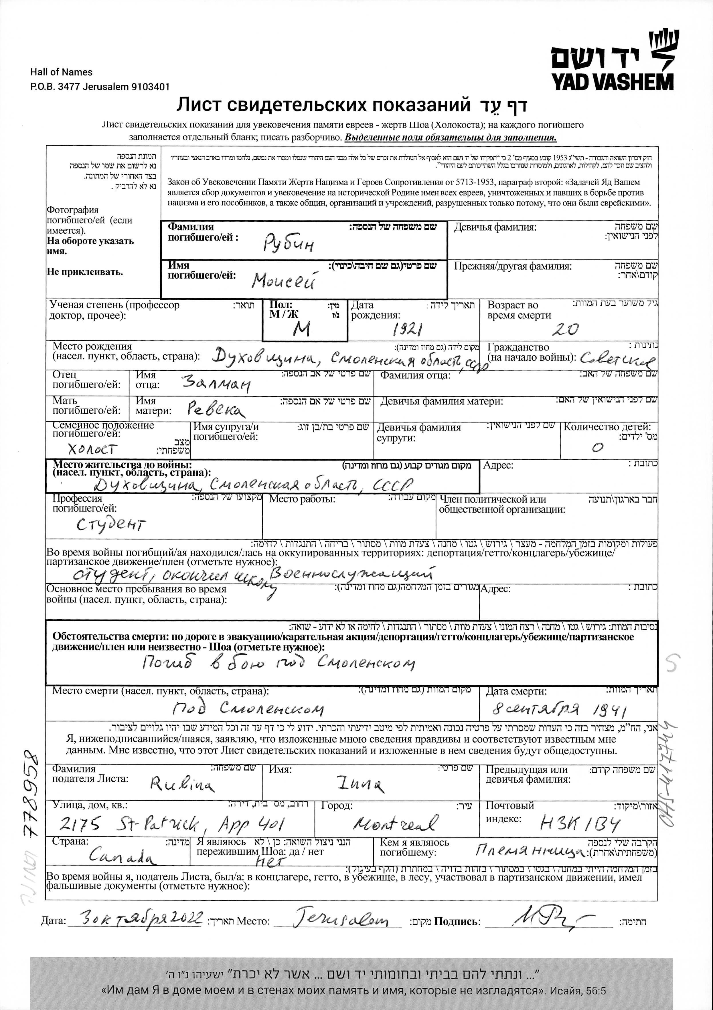 Moisey Rubin was born in Dukhovshchina, Russia (USSR), 1921. He was a military man. Prior to WWII he lived in Dukhovshchina, Russia (USSR). Moisey was killed in military service in WWII. Place of death: Smolensk, Russia (USSR), 08/09/1941.