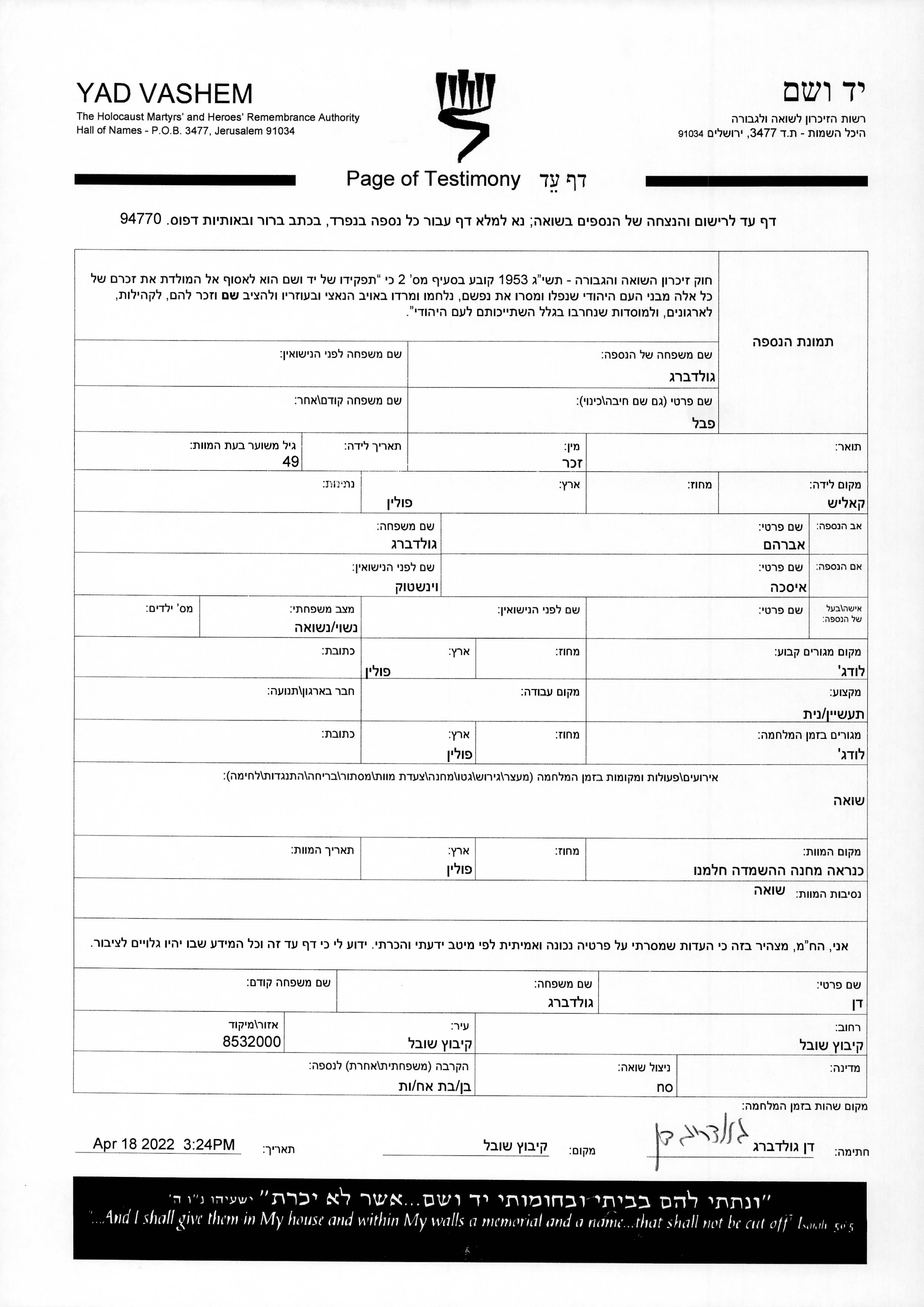 Goldberg Pavel Lodz, Poland Page of Testimony (digital signed)
