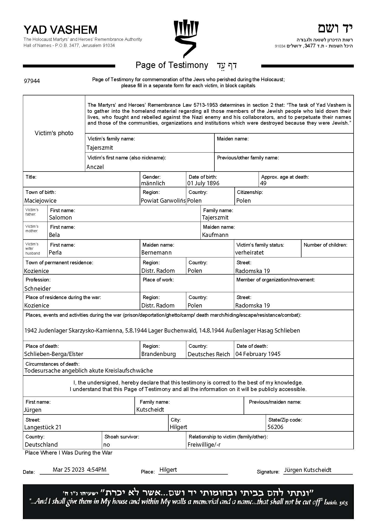 | Tajerszmit | Anczel | 1896 | Kozienice, Poland | Page of Testimony (digital) |
