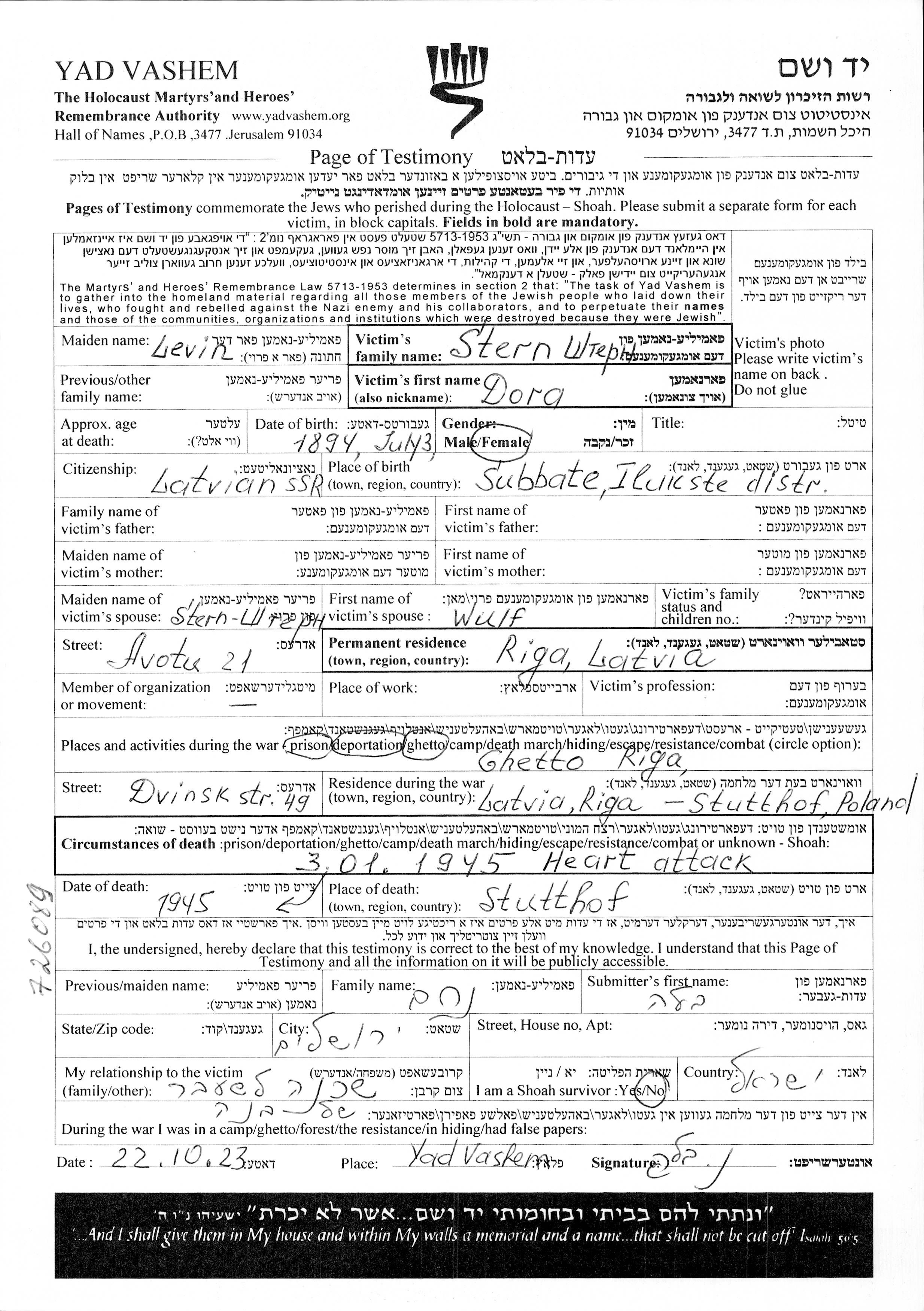 Dora Stern nee Levin was born in Subate, Latvia, 1894. Prior to WWII she lived in Riga, Latvia. During the war she was in Riga, Latvia. Dora was murdered in the Shoah. Place of death: Stutthof, Free City of Danzig, 03/01/1945.