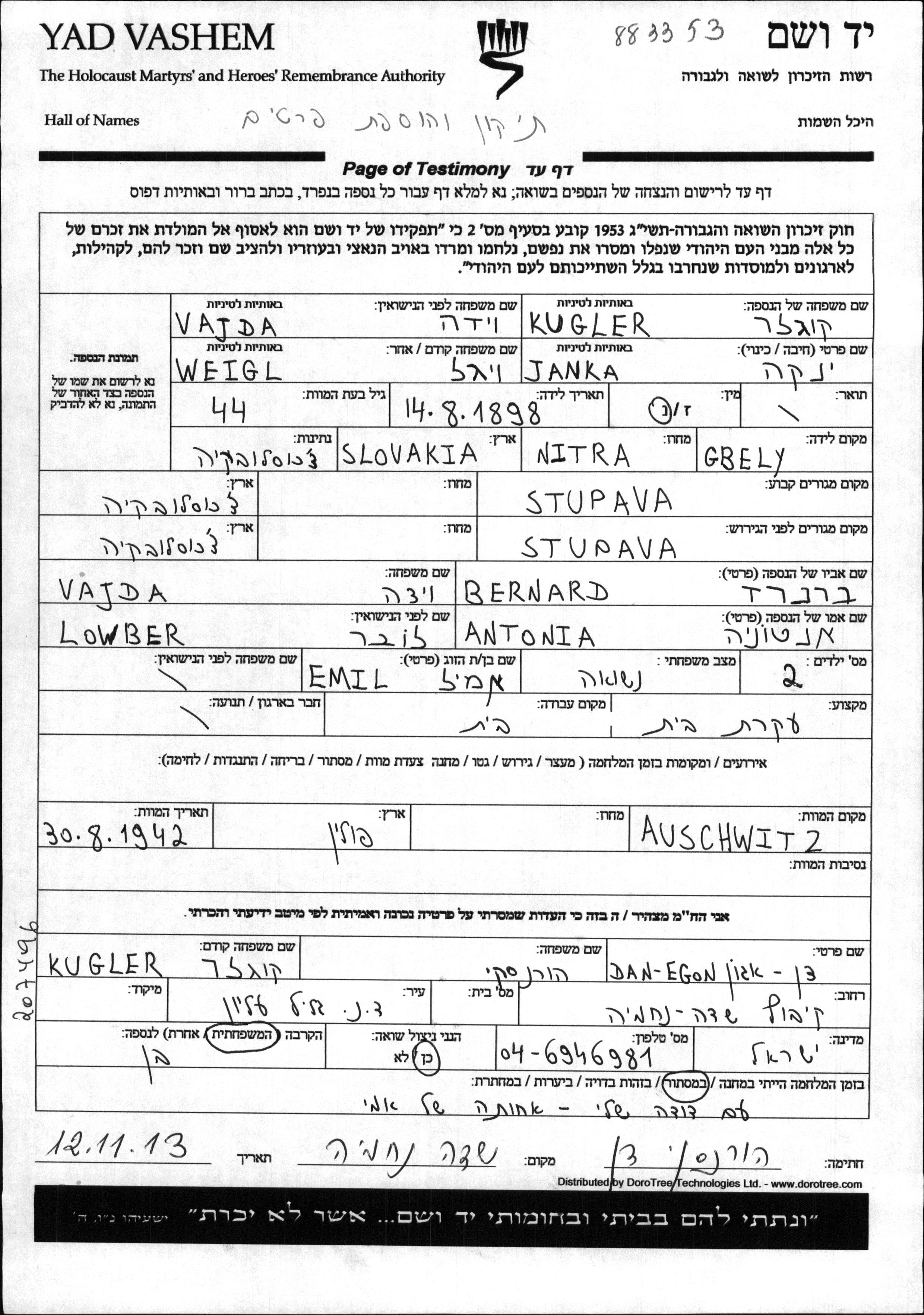 Kugler | Janka | Stupava, Czechoslovakia | Page of Testimony |