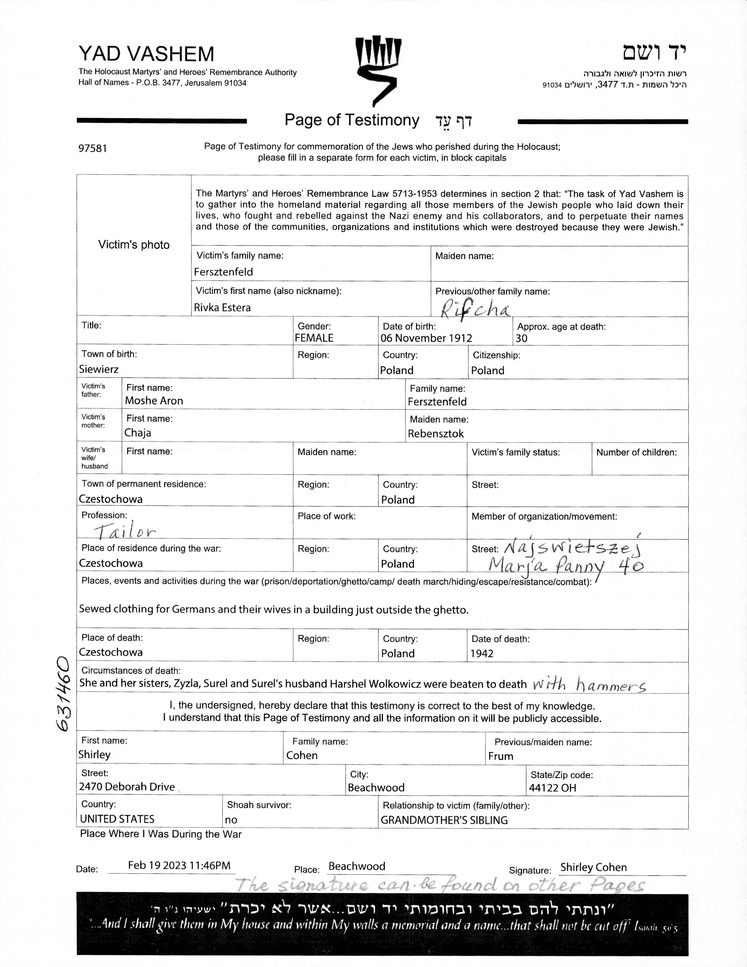 | Fersztenfeld | Rivka Estera | 1912 | Czestochowa, Poland | Page of Testimony (digital signed) |
